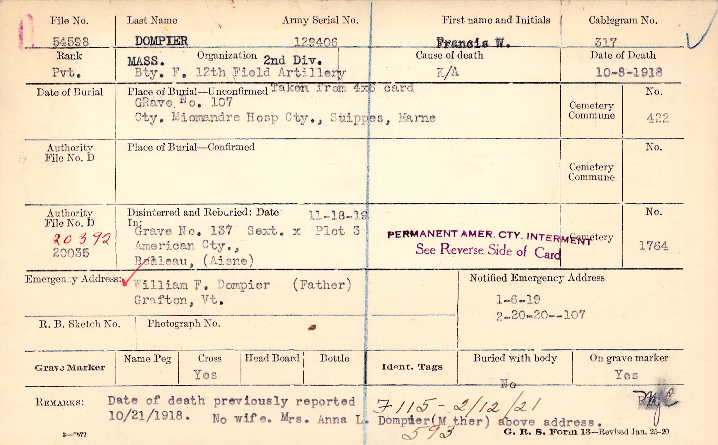 Date of death previously reported 10/21/1918. No wife. Mrs. Anna L. Dompier (Mother) above address, F115 - 2/12/21 593