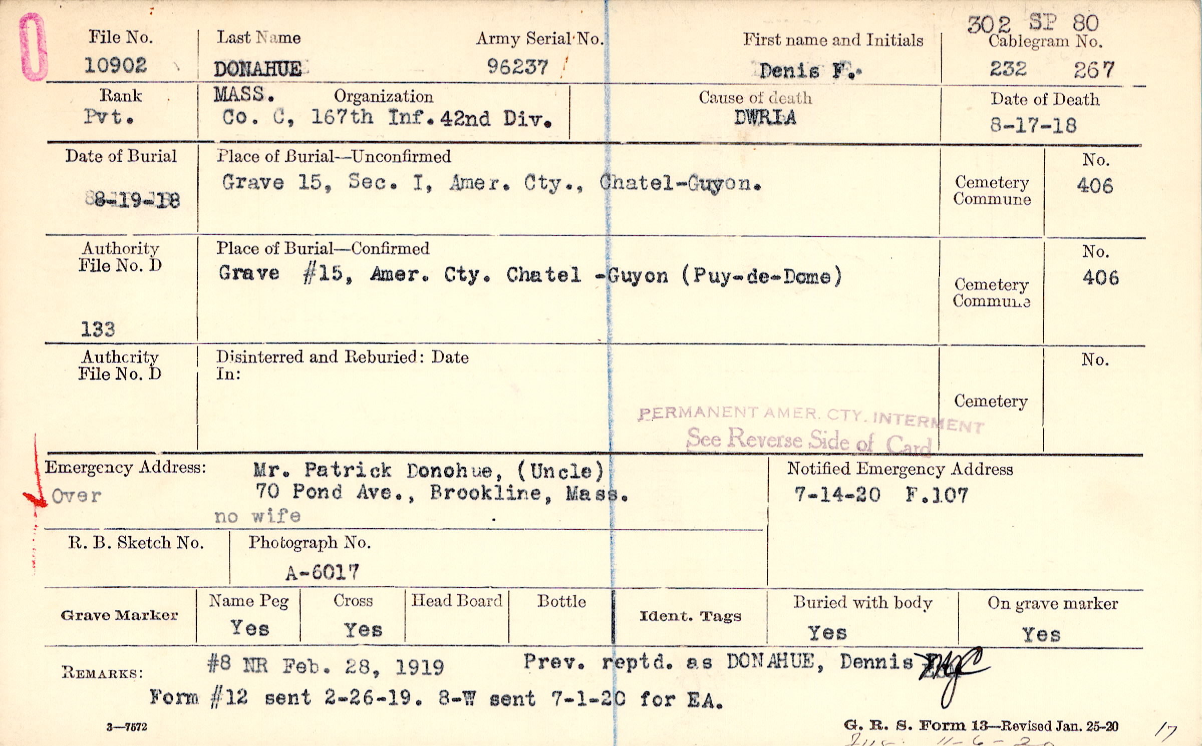 #8 NR Feb. 28, 1919. 8-W sent 7-1-20 for EA., Form #12 sent 2-26-19., F115 11-6-20 17