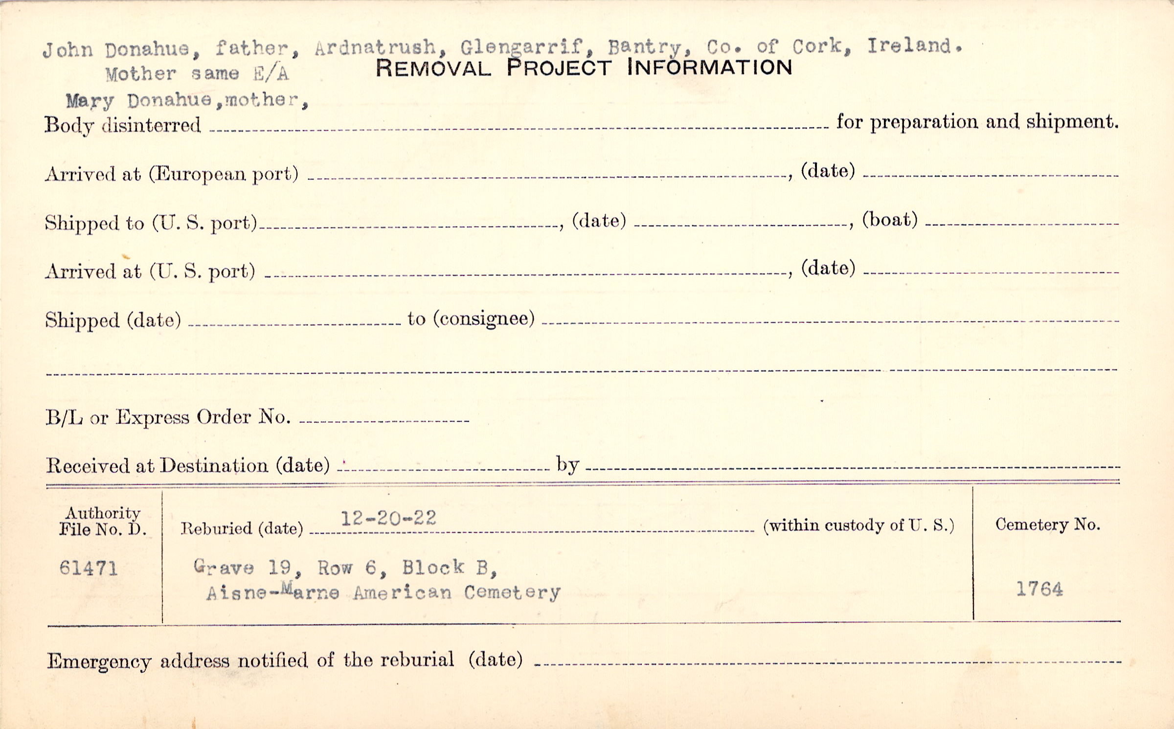 John Donahue, father, Ardnatrush, Glengarrif, Bantry, Co. of Cork, Ireland, Mother same E/A, Mary Donahue, mother |