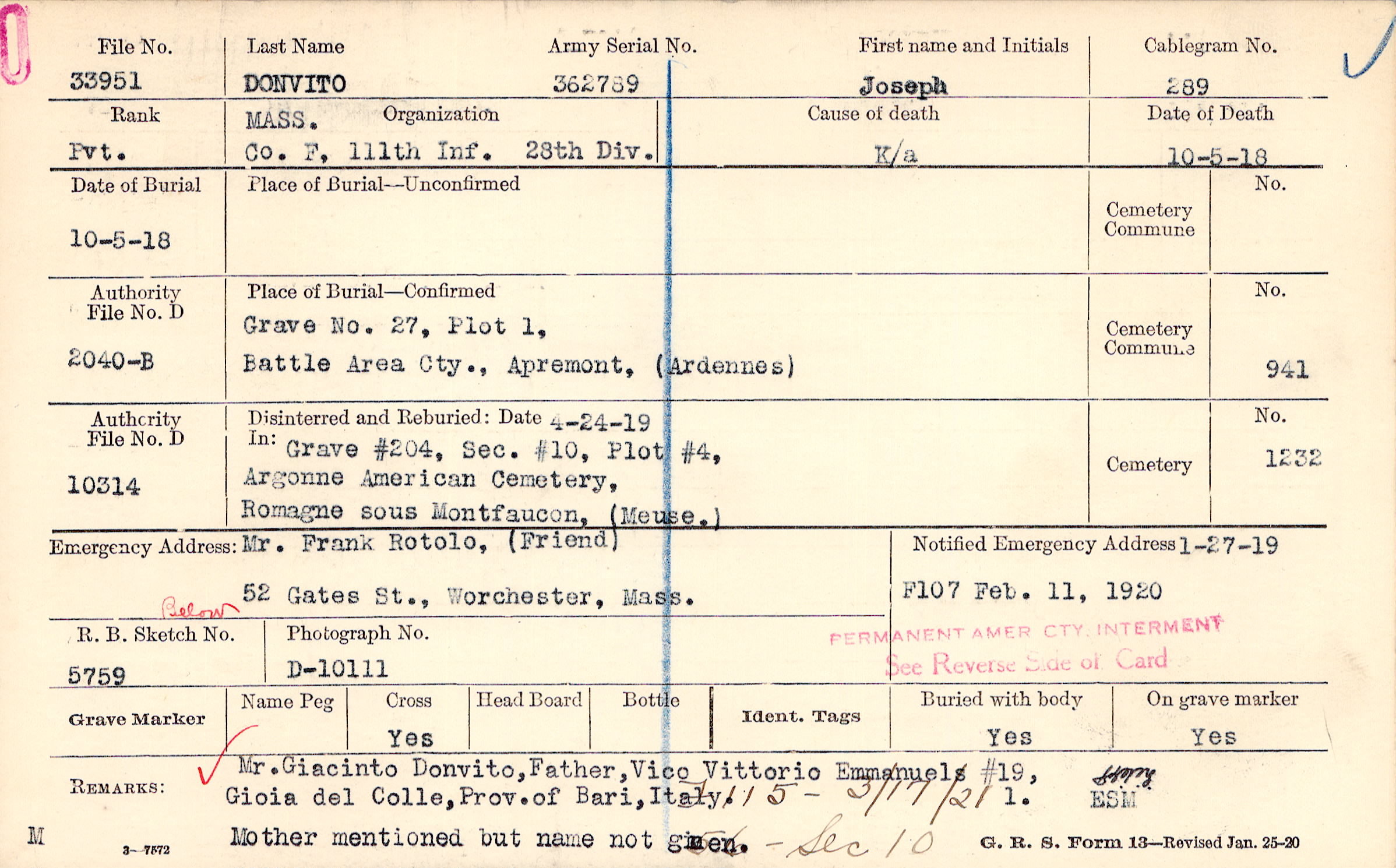 Mr. Frank Rotolo, (Friend), 52 Gates St., Worchester, Mass., Below