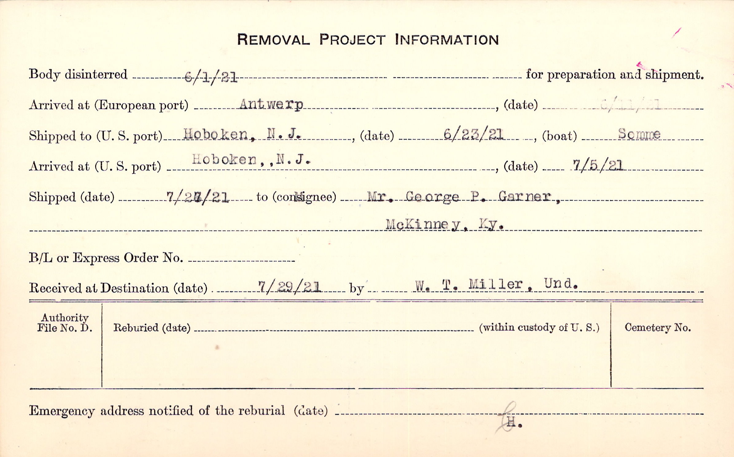 Body disinterred 6/1/1921 for preparation and shipment.