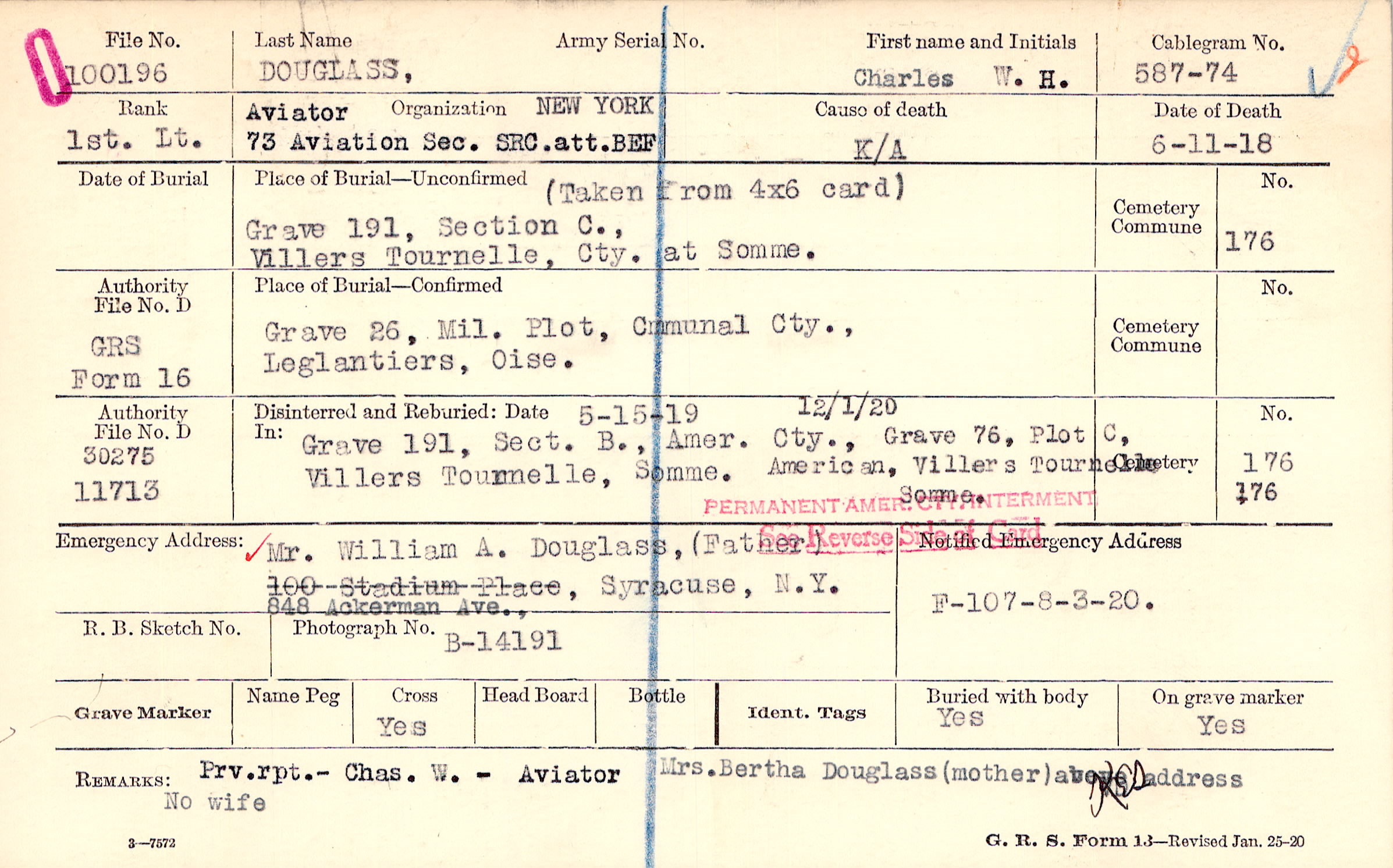 Mr. William A. Douglass, (Father), 848 Ackerman Ave., Syracuse, N.Y.