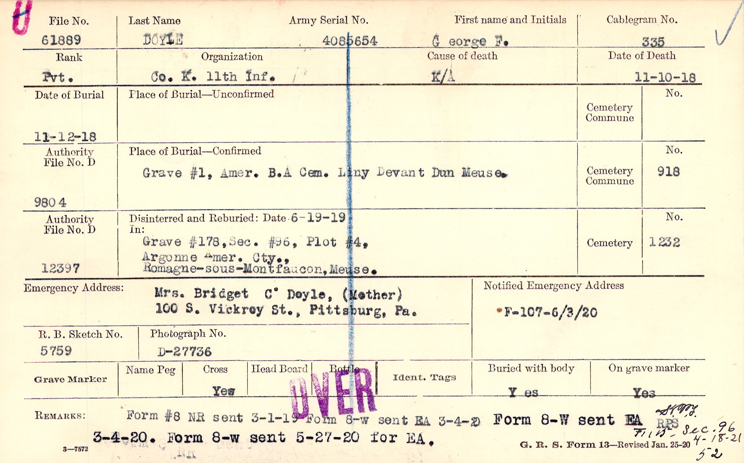 Mrs. Bridget C. Doyle, (Mother), 100 S. Vickrey St., Pittsburg, Pa.