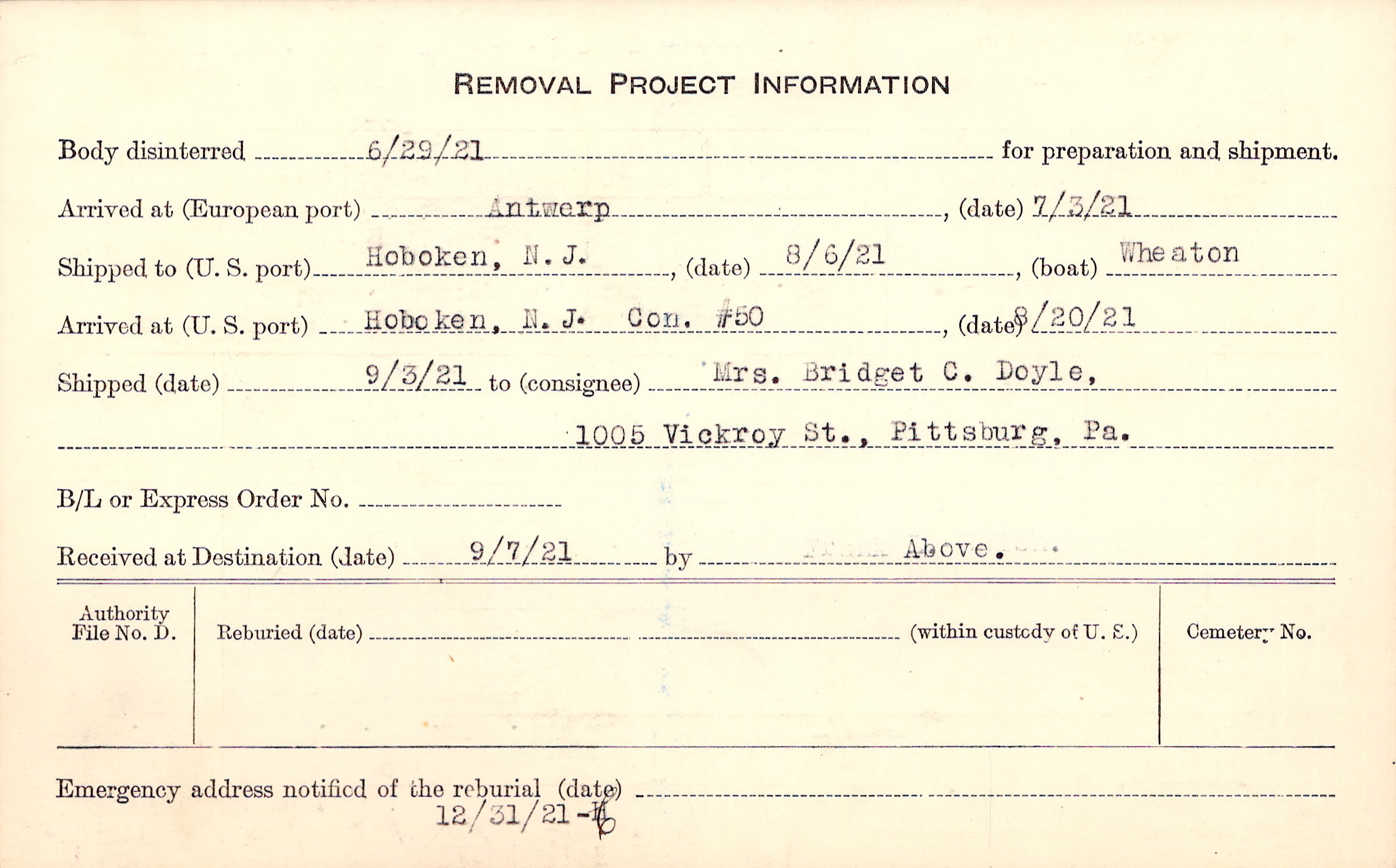 Body disinterred 6/29/1921 for preparation and shipment.
