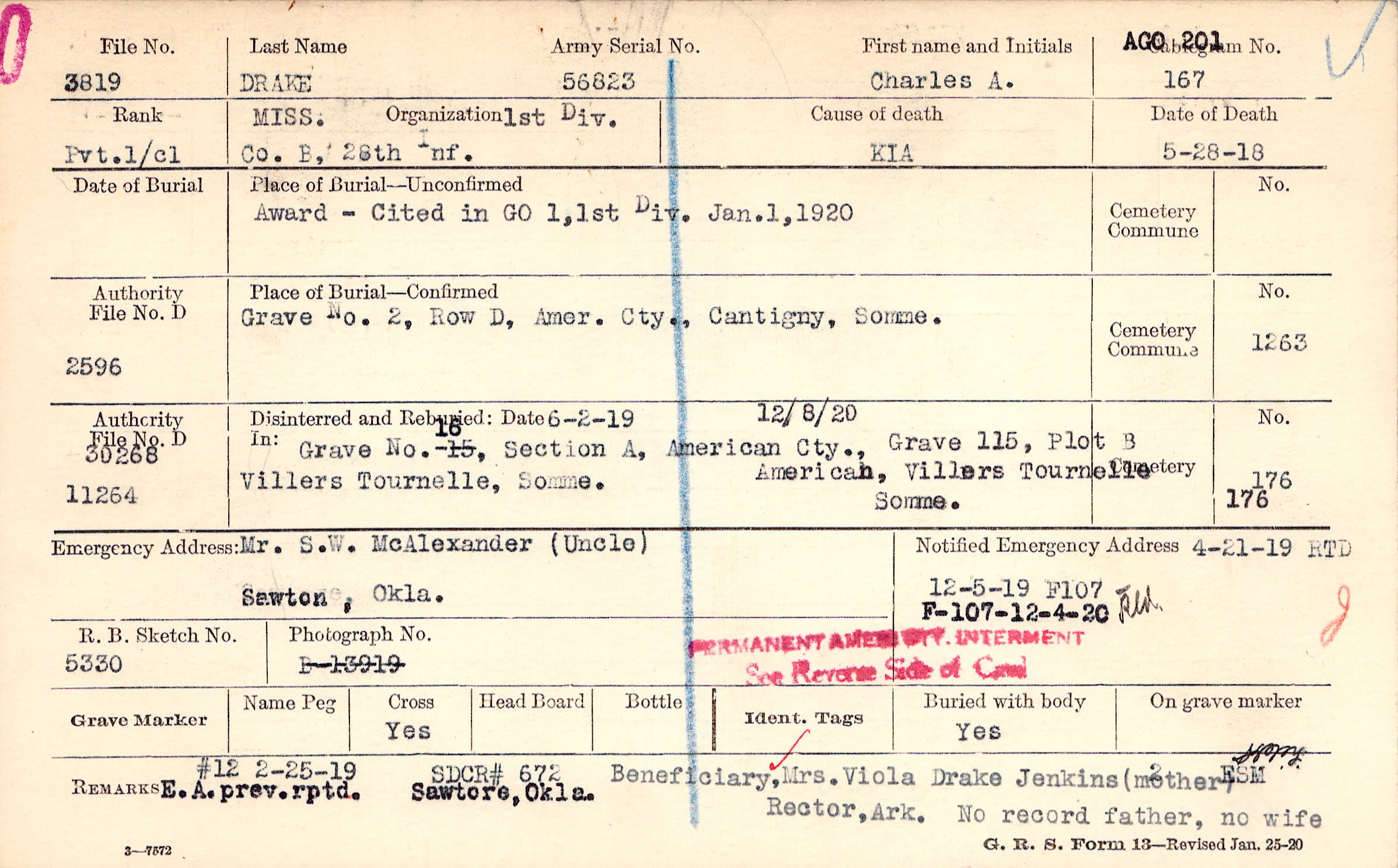 Beneficiary, Mrs. Viola Drake Jenkins (mother) Rector, Ark. No record of father, no wife E.A. prev. rptd.Sawtore, Okla., #12 2-25-19, #12 2-25-19 SDCR# 672; Beneficiary, Mrs. Viola Drake Jenkins(mother ) Rector, Ark. No record father, no wife; E.A. prev.rptd. Sawtore, Okla.
