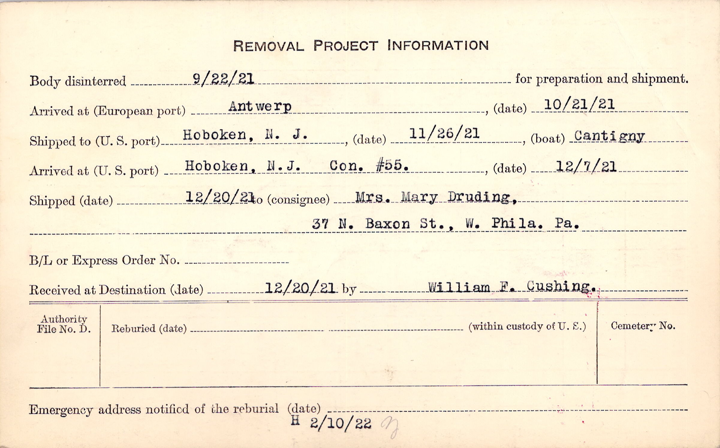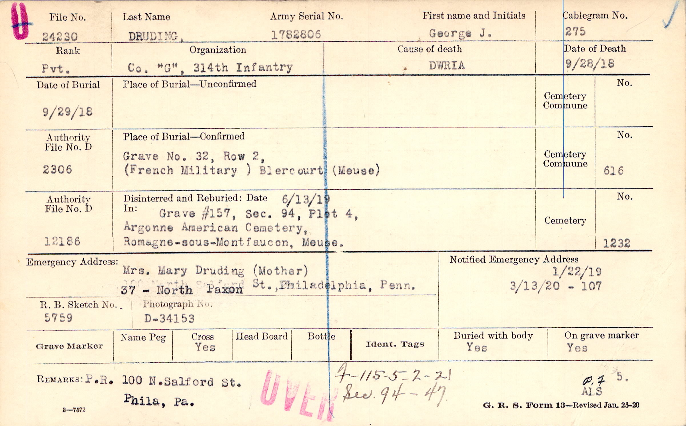 Mrs. Mary Druding (Mother), 37 - North Paxon St., Philadelphia, Penn., P.R. 100 N.Salford St. Phila, Pa.