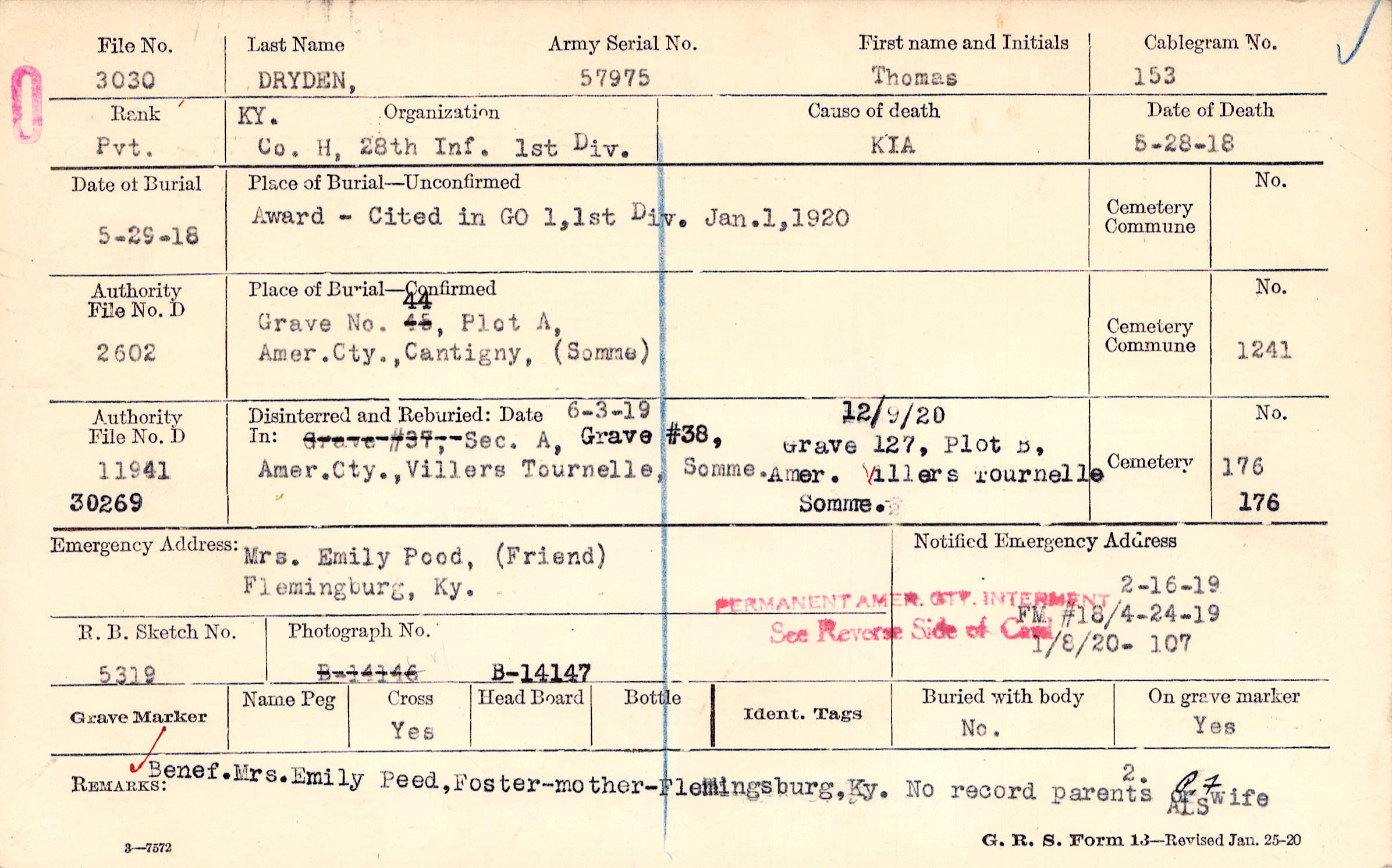 Benef. Mrs. Emily Peed, Foster-mother-Flemingsburg, Ky. No record parents or wife.