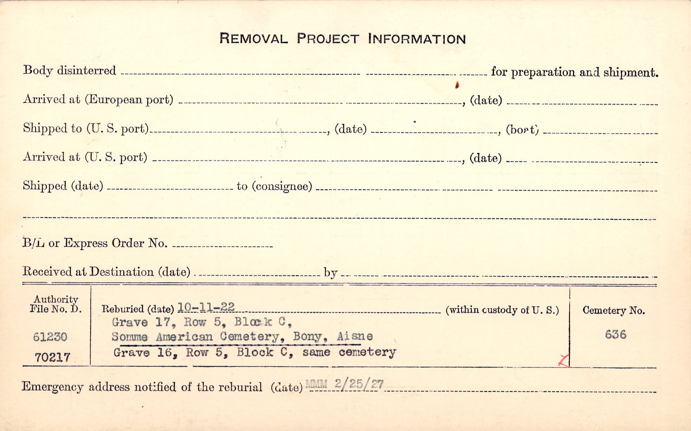 Prior Burial in Foreign Cemetery |