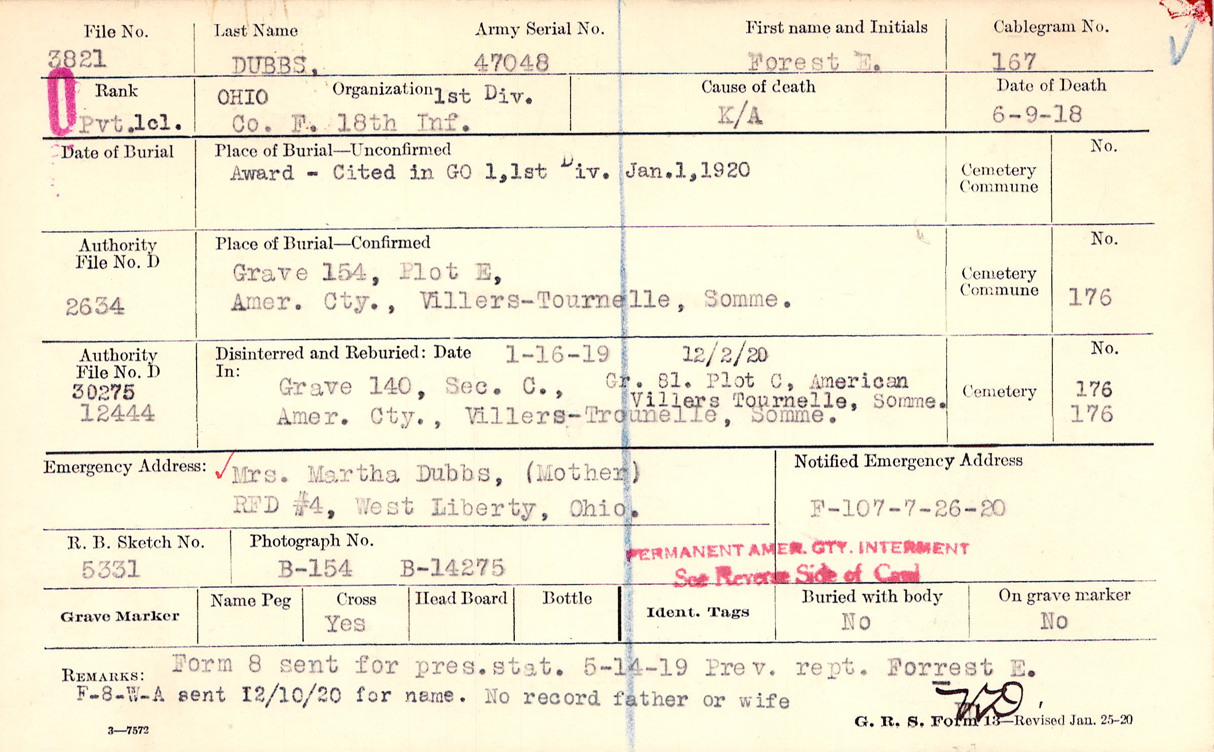 Form 8 sent for pres.stat. 5-14-19 Prev. rept. Forrest E. F-8-W-A sent 12/10/20 for name. No record of father or wife