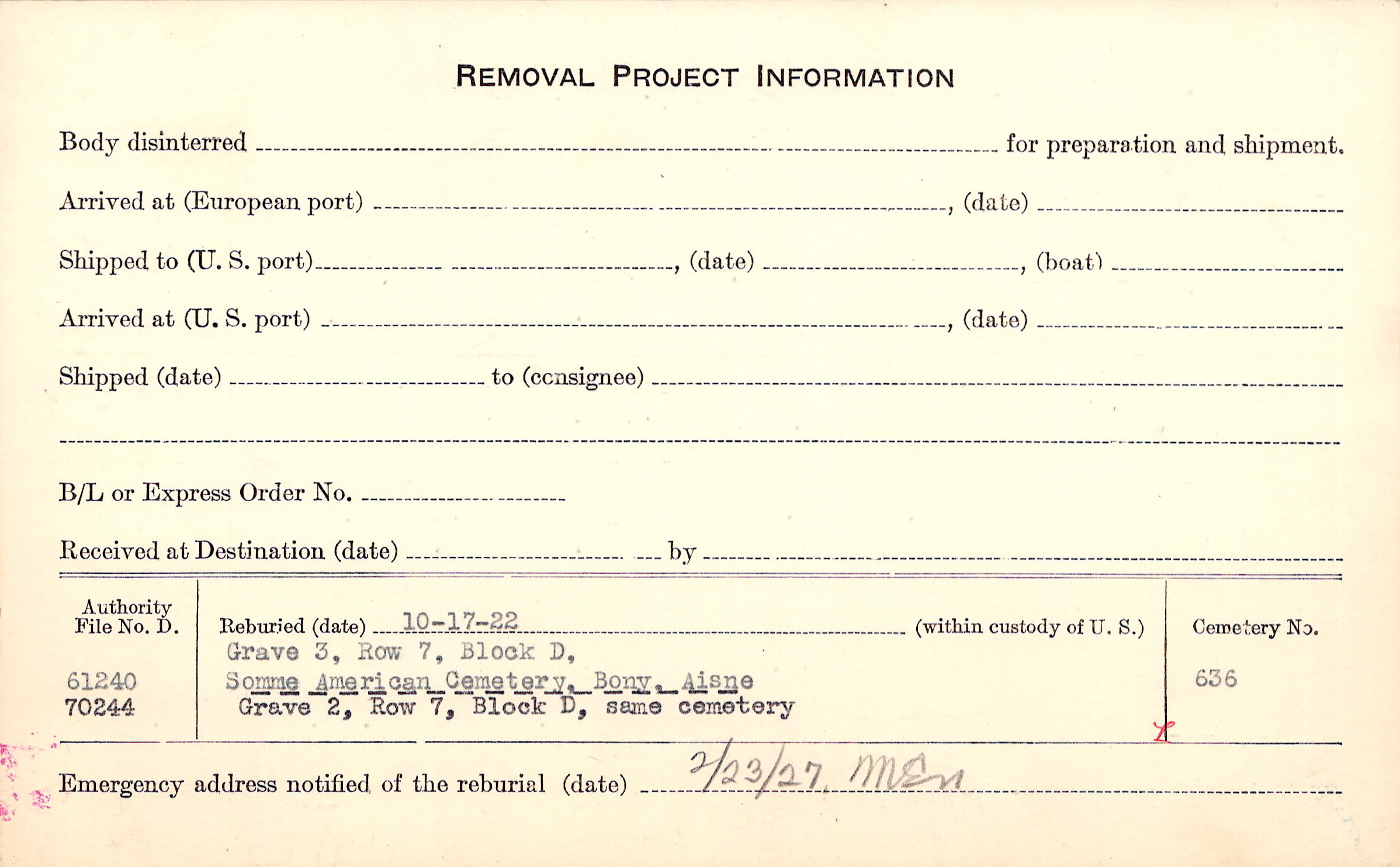 Prior Burial in Foreign Cemetery |