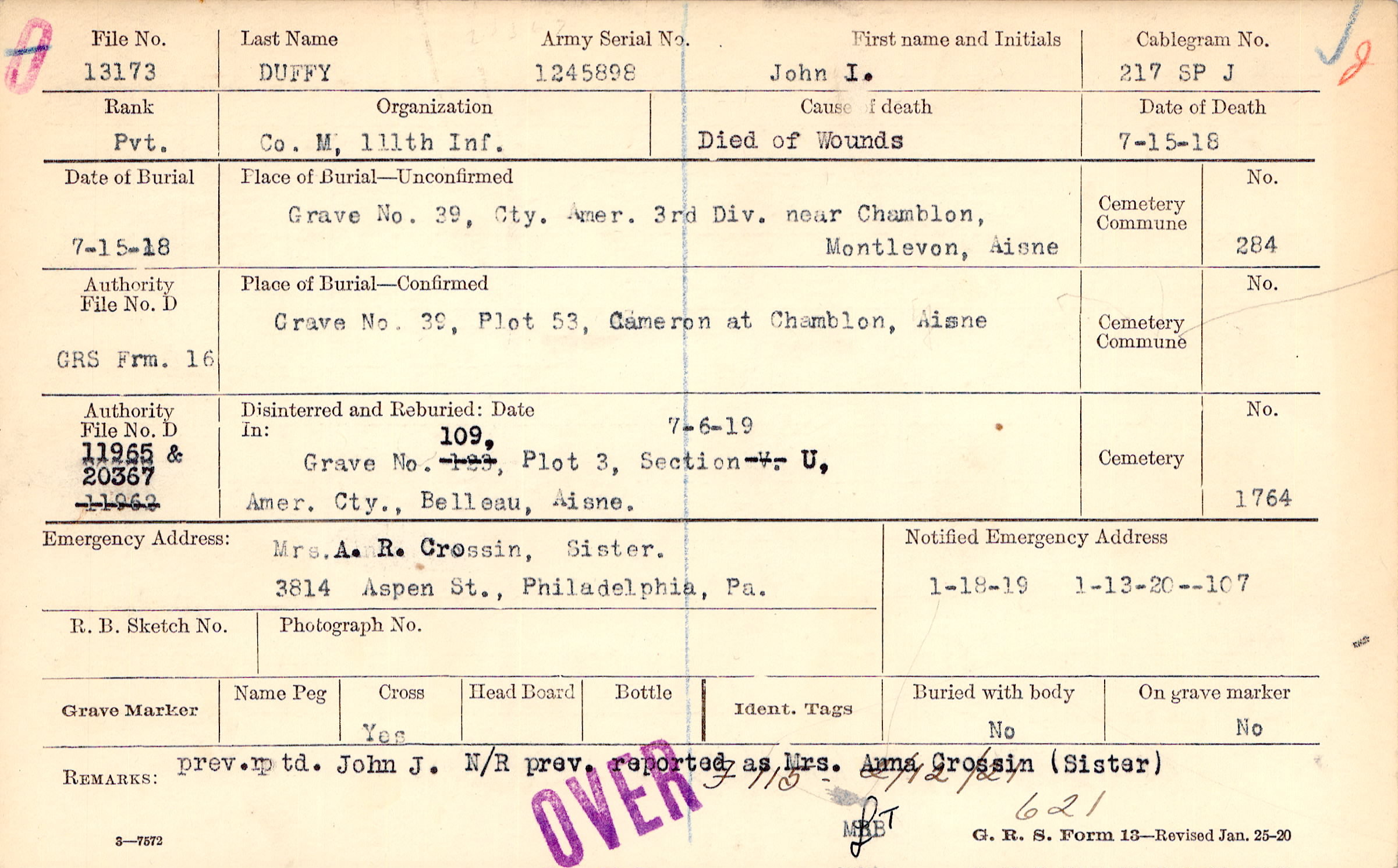 prev. rptd. John J. N/R prev. reported as Mrs. Anna Crossin, (Sister), 2/12/1921
