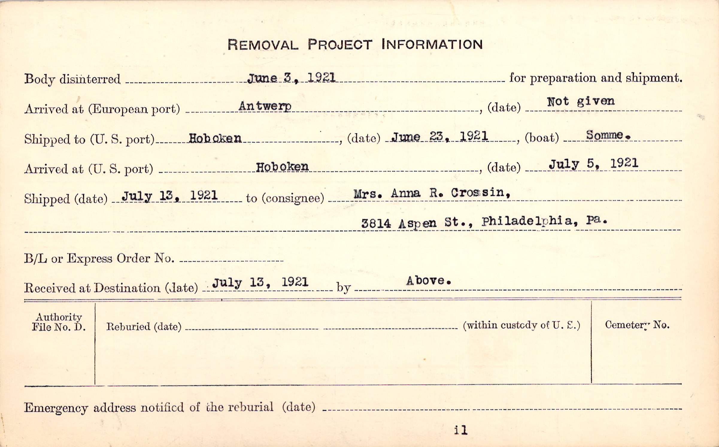 Body disinterred 6/3/1921 for preparation and shipment.