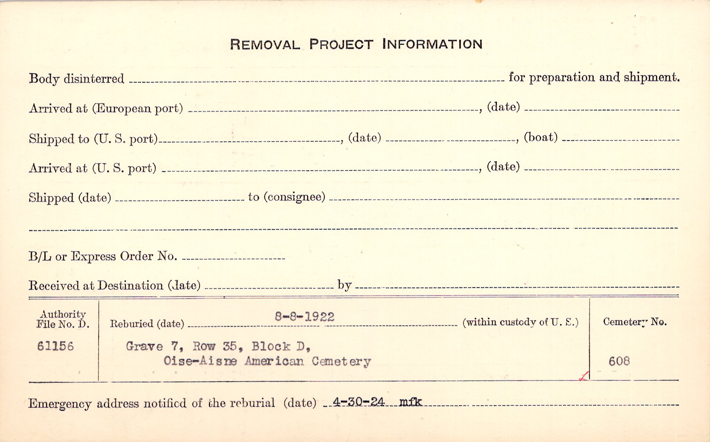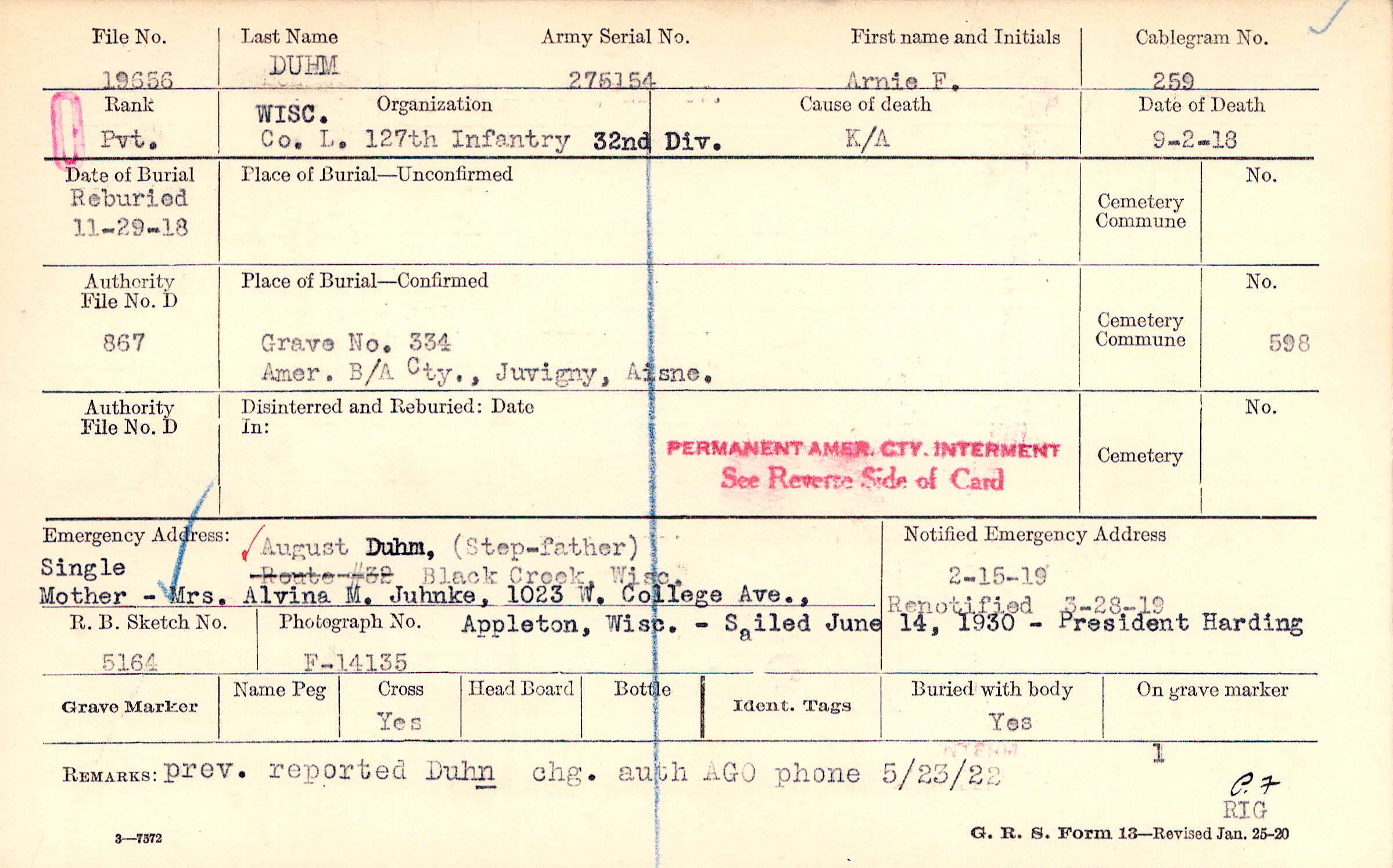 Grave 334, Amer. B/A Cty., Juvigny, Aisne.