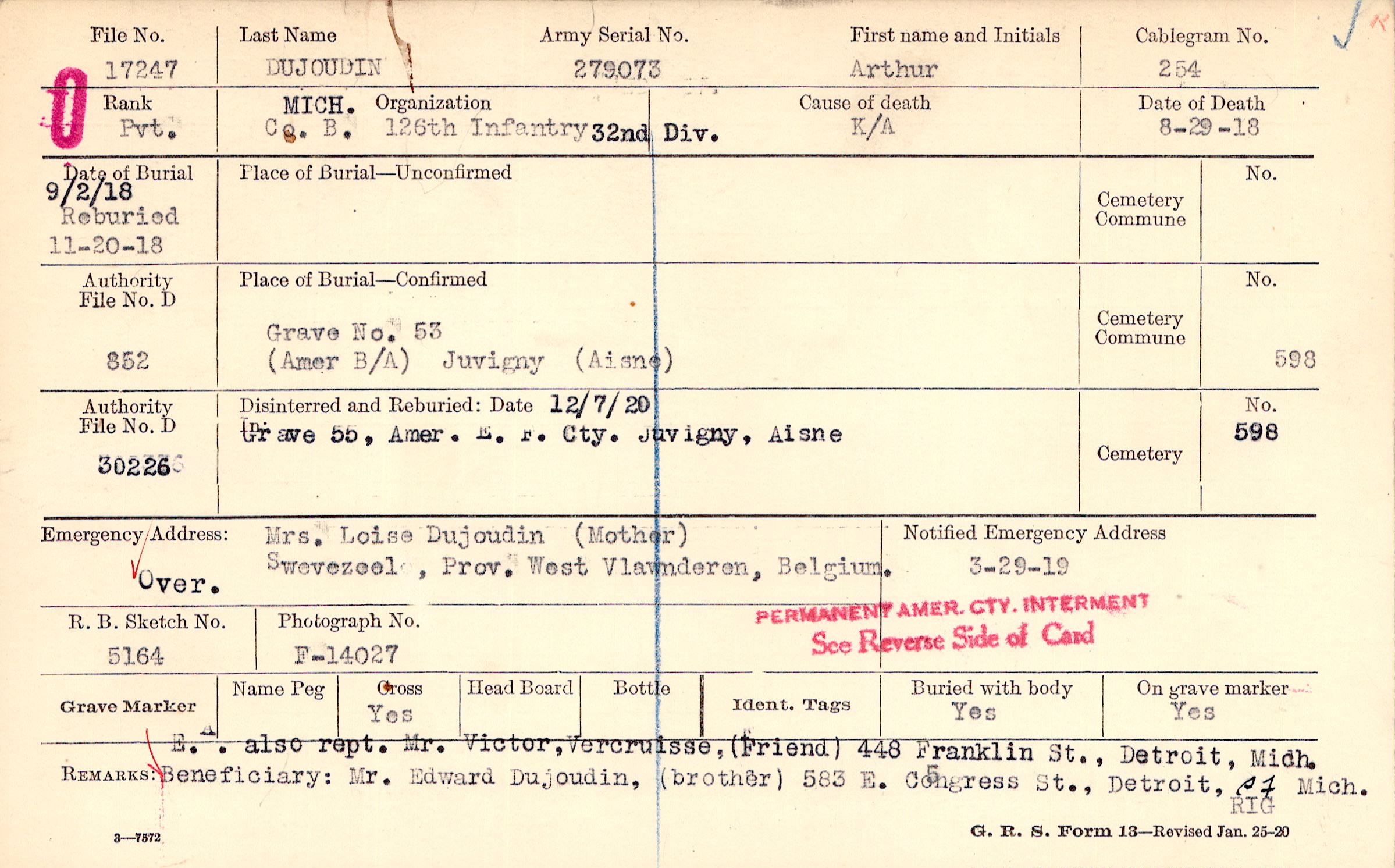 E. A. also rept. Mr. Victor, Vercruisse, (Friend) 448 Franklin St., Detroit, Mich. Beneficiary: Mr. Edward Dujoudin, (brother) 583 E. Congress St., Detroit, Mich.