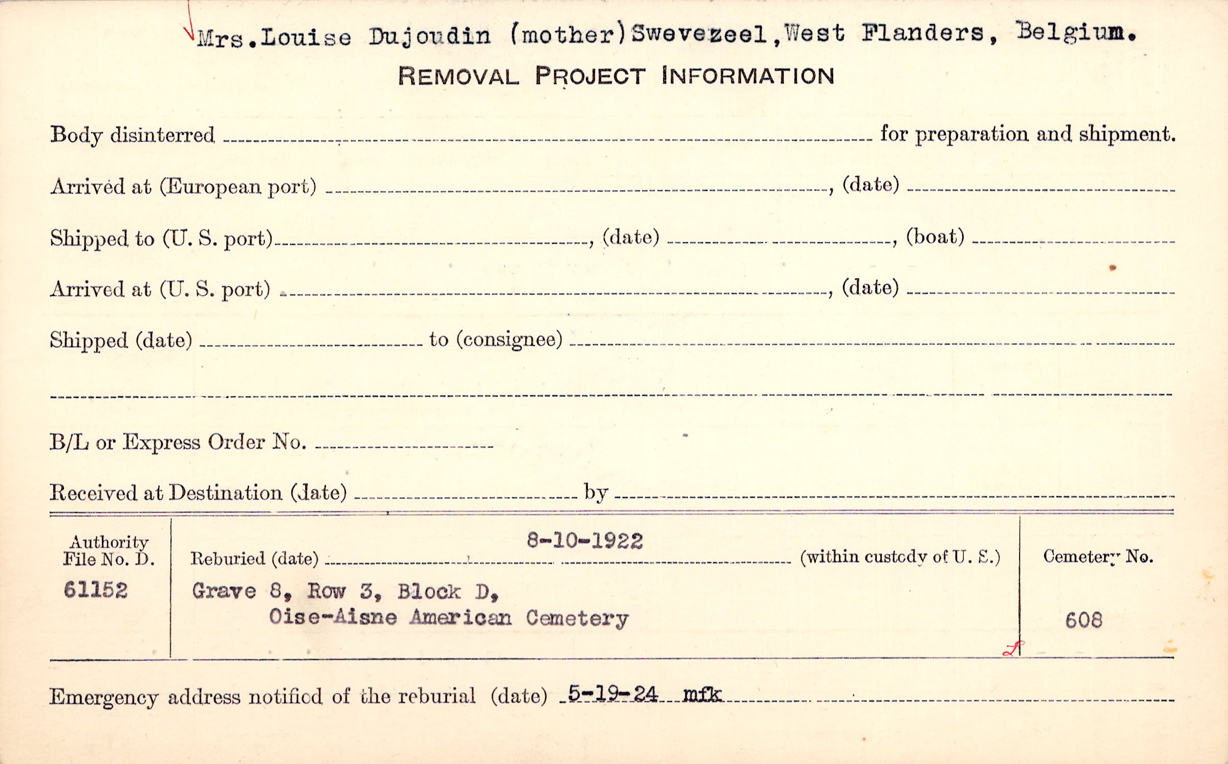 Mrs. Louise Dujoudin (mother) Swevezeel, West Flanders, Belgium. |