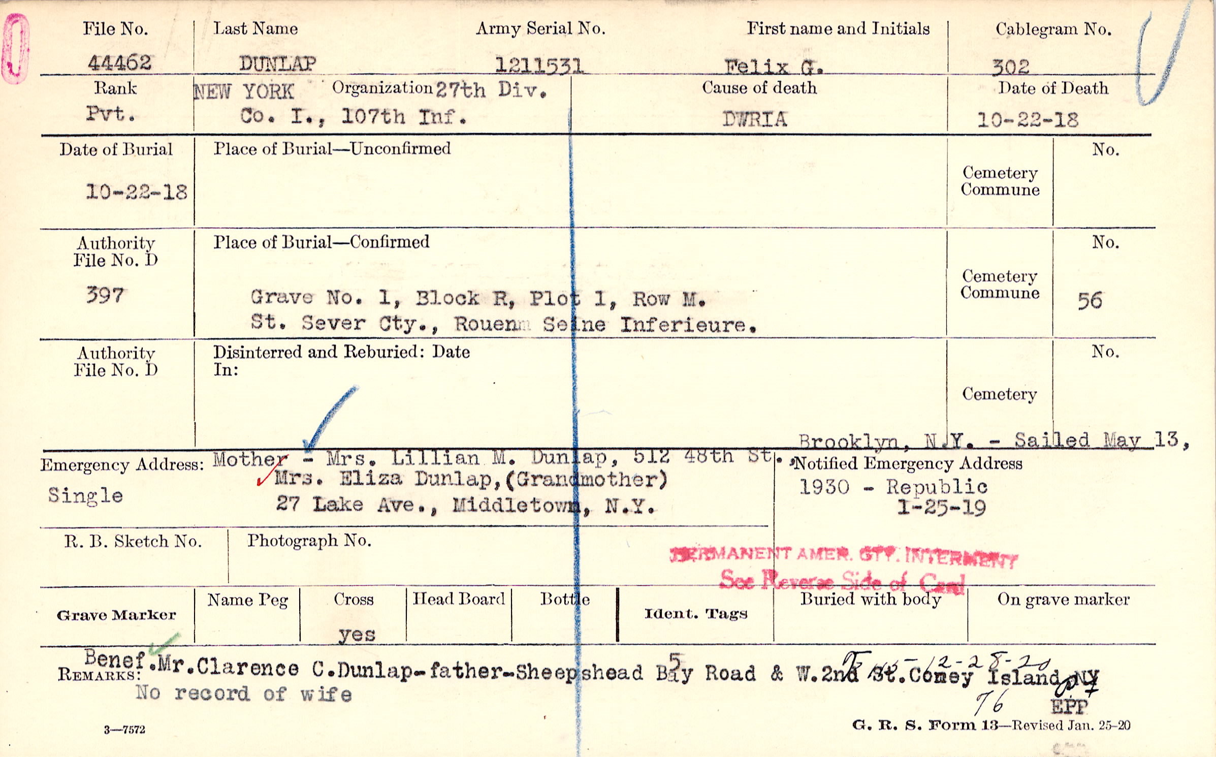 Benef. Mr. Clarence C. Dunlap-father-Sheepshead Bay Road & W. 2nd St., Coney Island, NY No record of wife