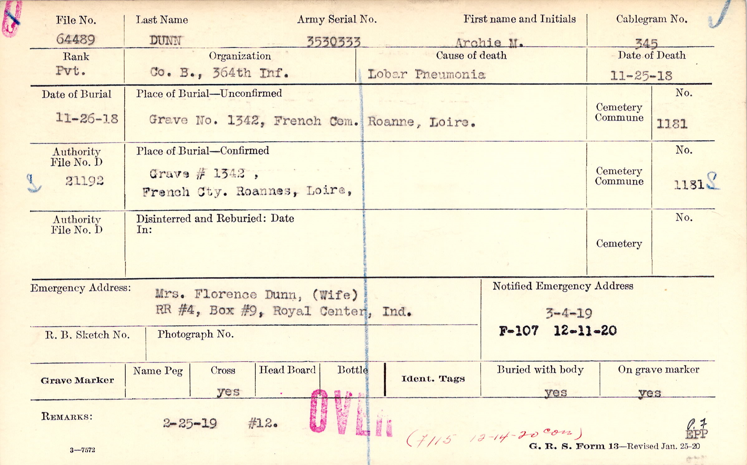 Mrs. Florence Dunn, (Wife), RR #4, Box #9, Royal Center, Ind.