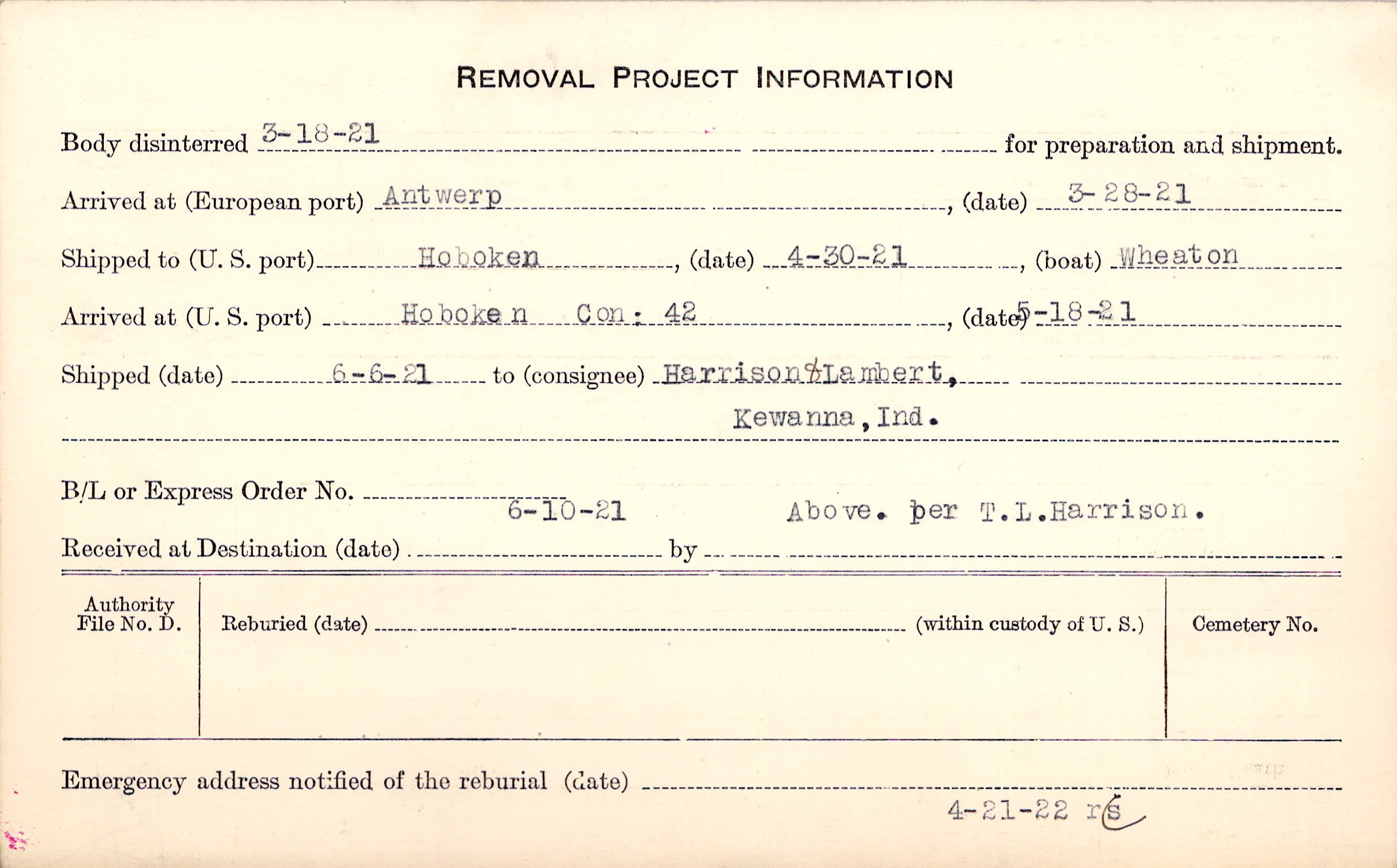 Body disinterred 3/18/1921 for preparation and shipment.