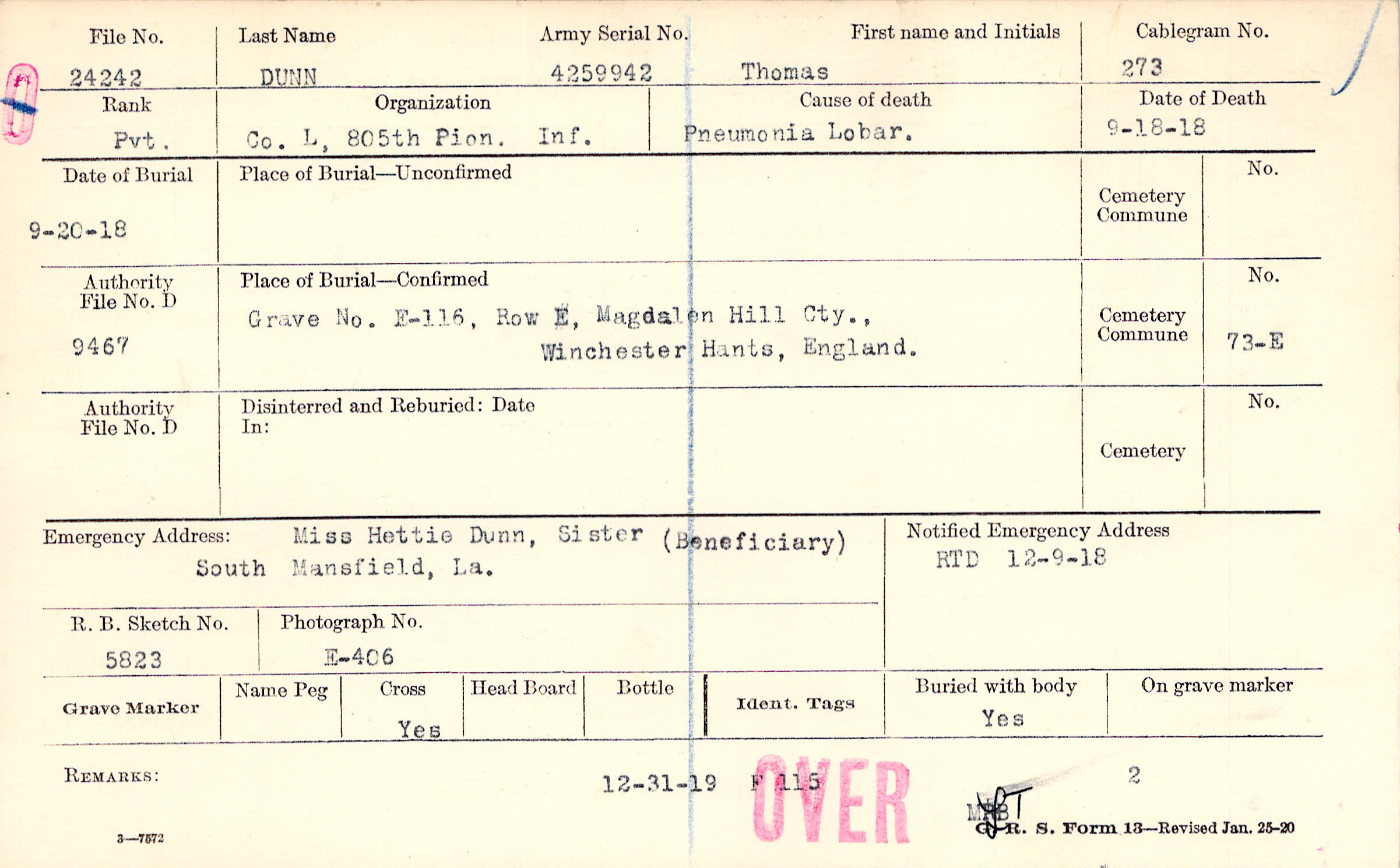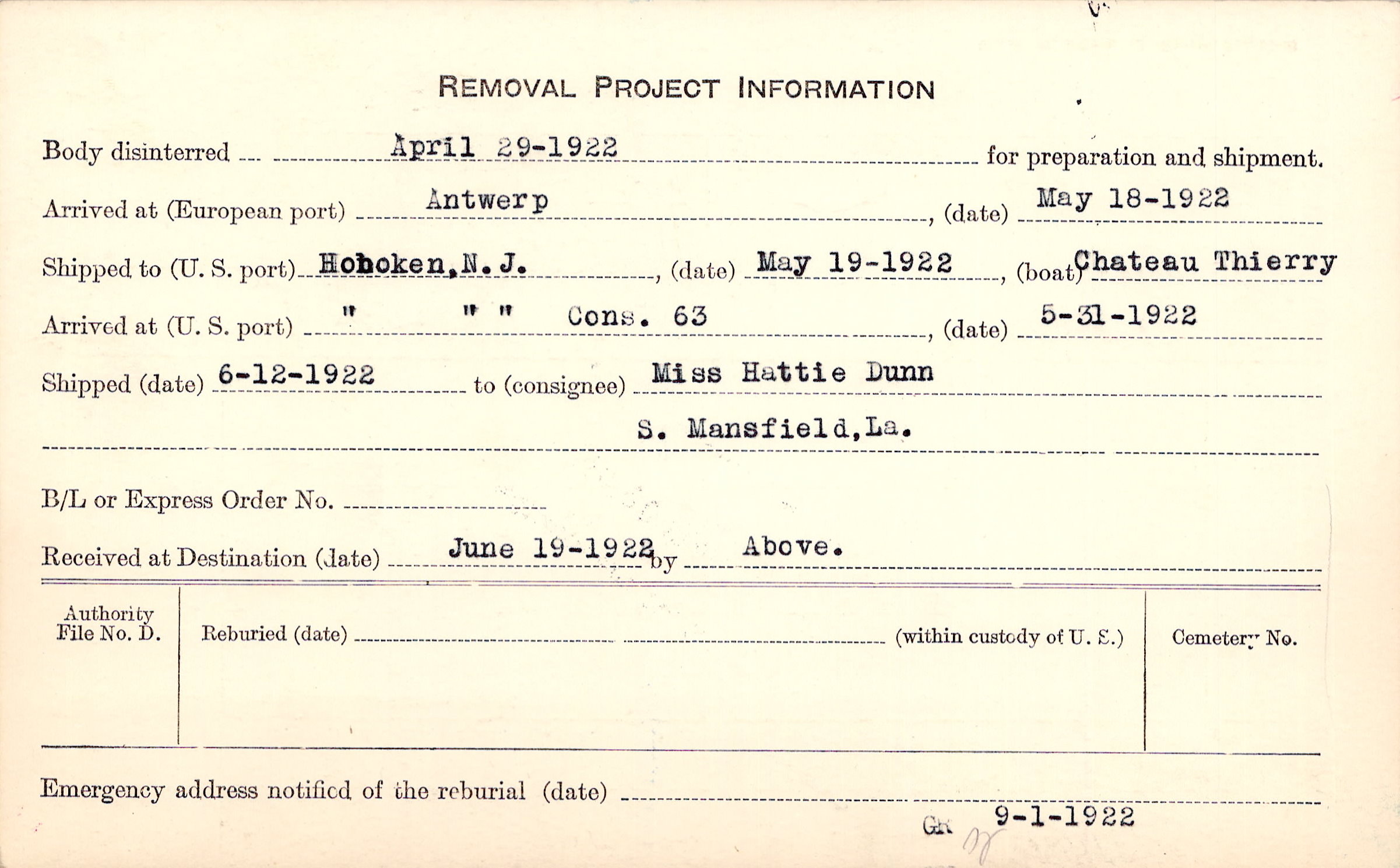 Miss Hettie Dunn, Sister (Beneficiary), South Mansfield, La.
