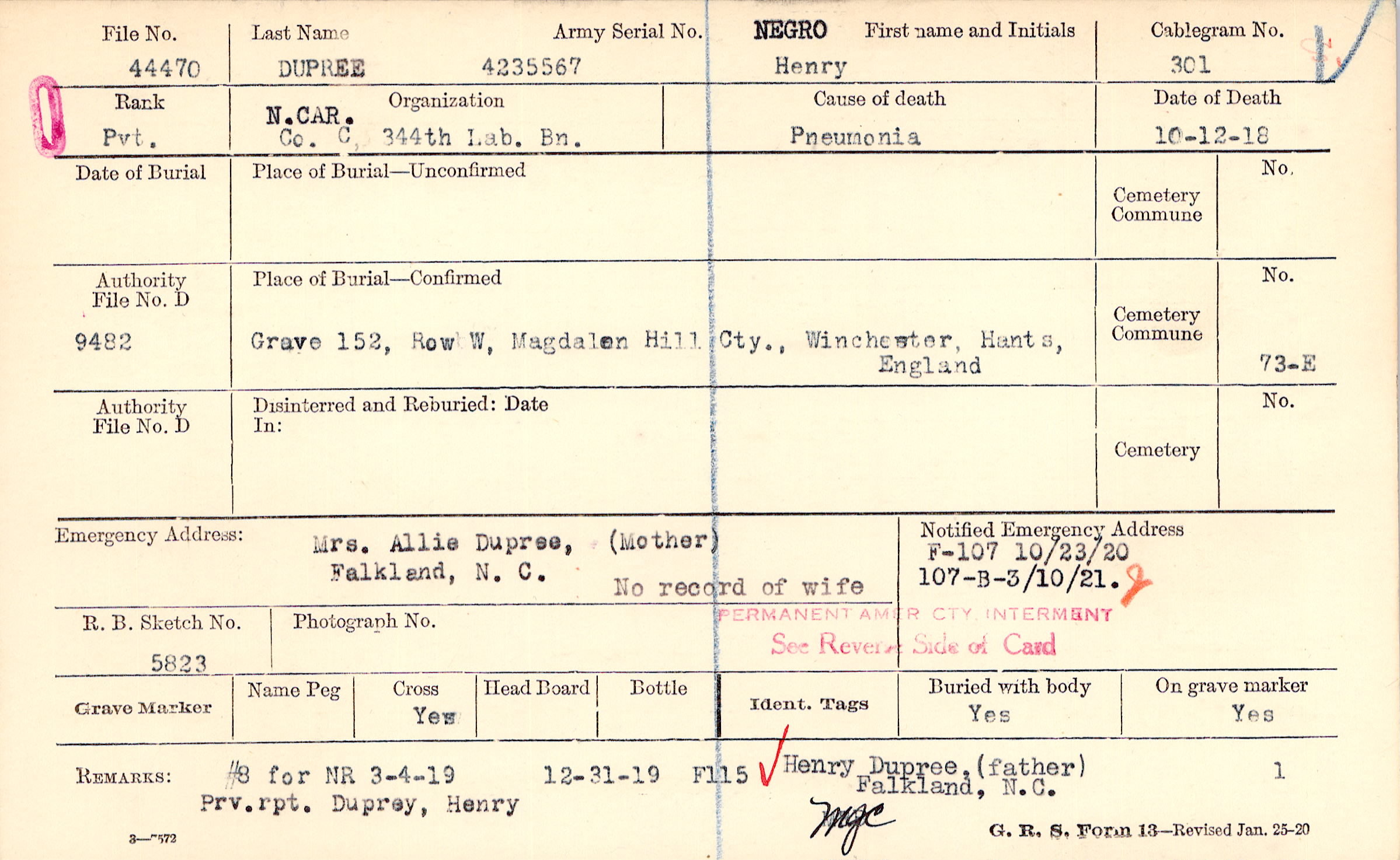 Mrs. Allie Dupree, (Mother), Falkland, N. C., No record of wife