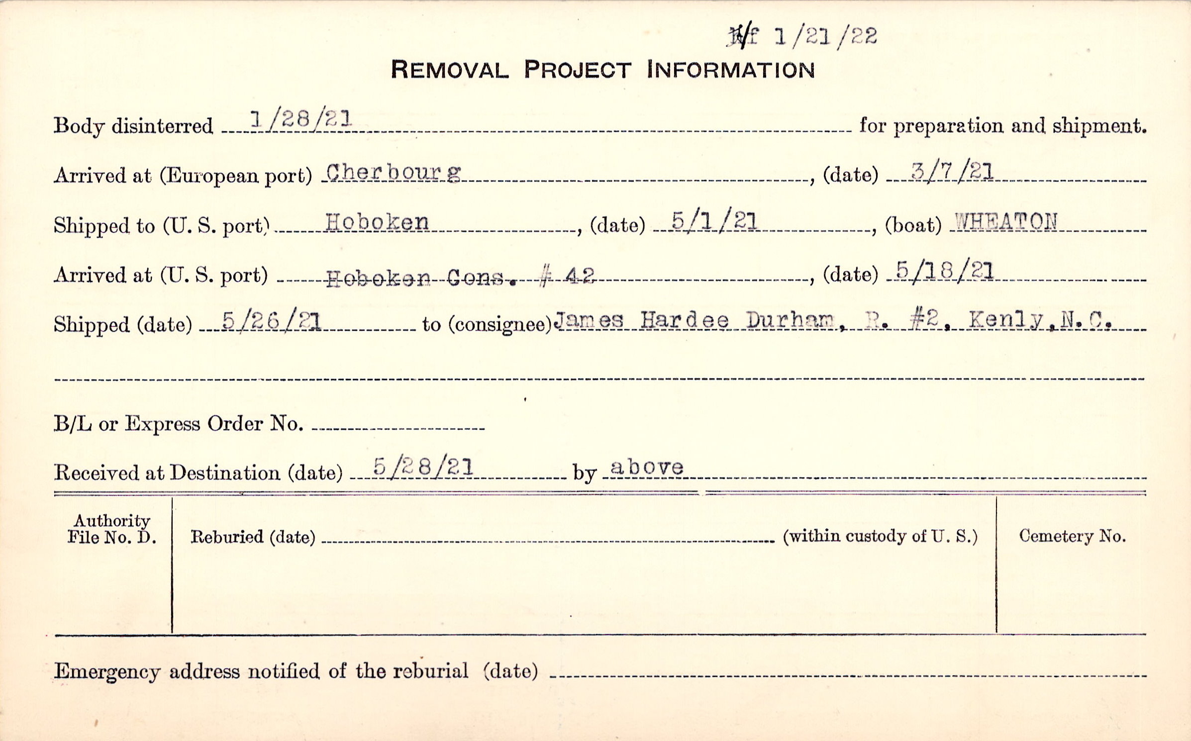 Body disinterred 1/28/1921 for preparation and shipment.