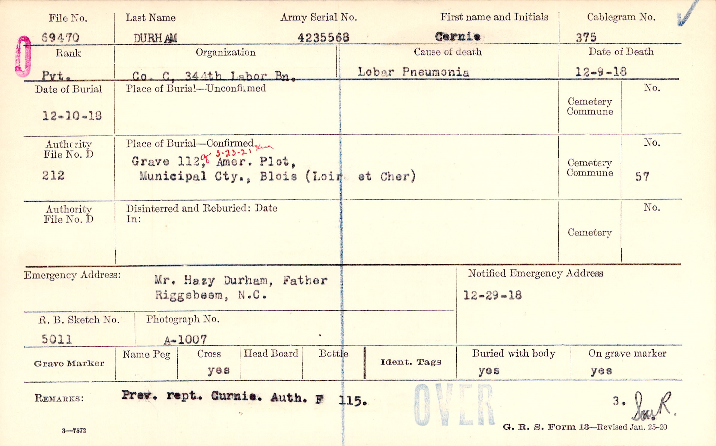 Grave 112G, Amer. Plot, Municipal Cty., Blois, Loir et Cher
