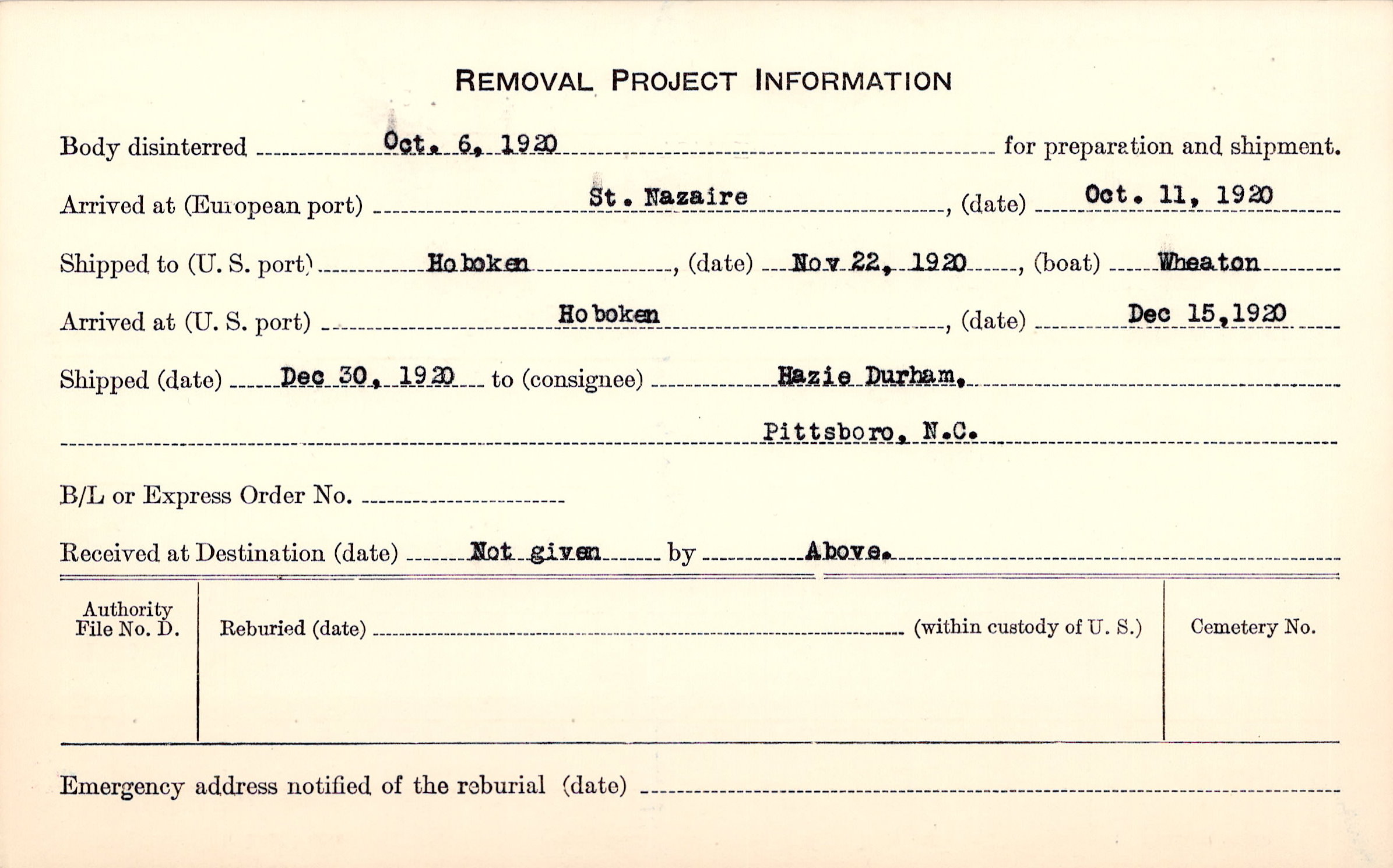 Body disinterred 10/6/1920 for preparation and shipment.