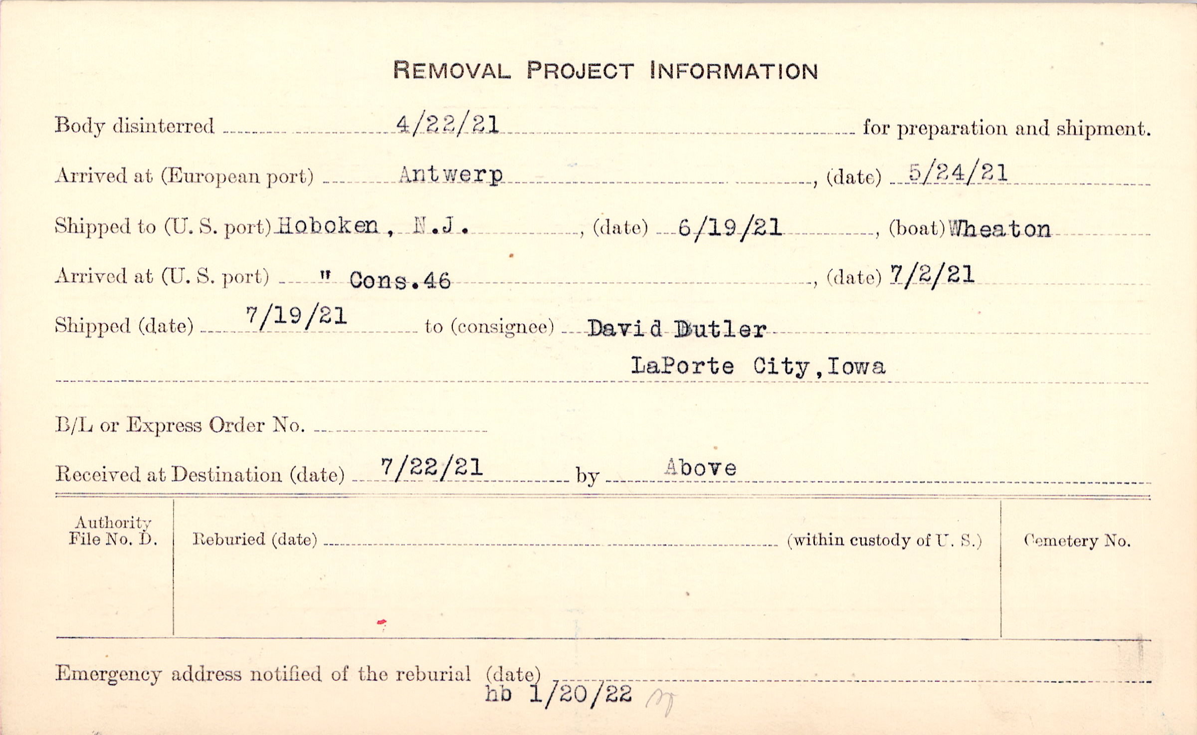 Body disinterred 4/22/1921 for preparation and shipment.