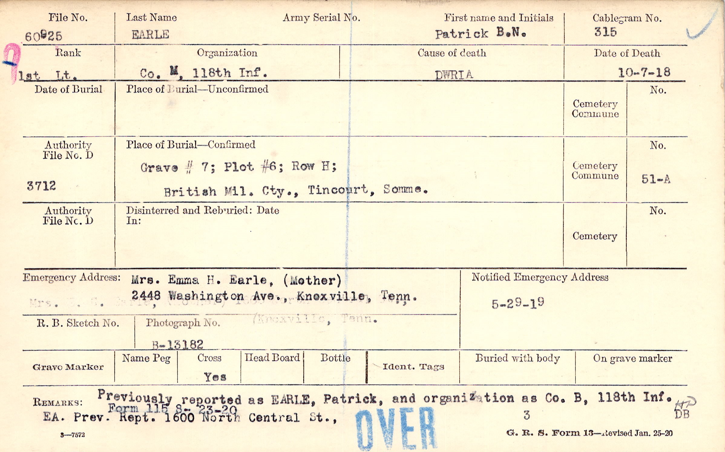 Previously reported as EARLE, Patrick, and organization as Co. B, 118th Inf. EA. Prev. Rept 1600 North Central St.,, Form 115 S- 23-20