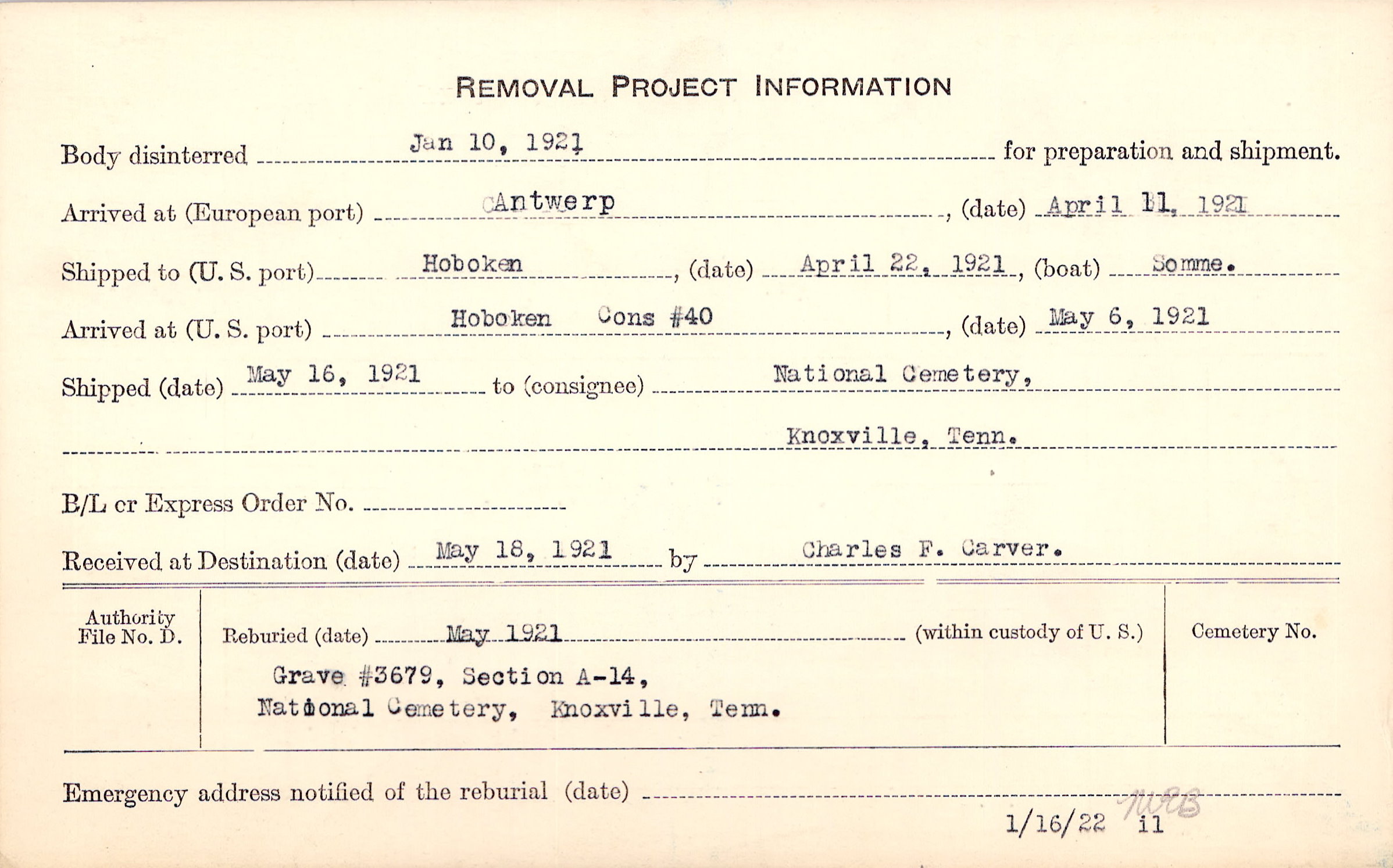 Body disinterred 1/10/1921 for preparation and shipment.