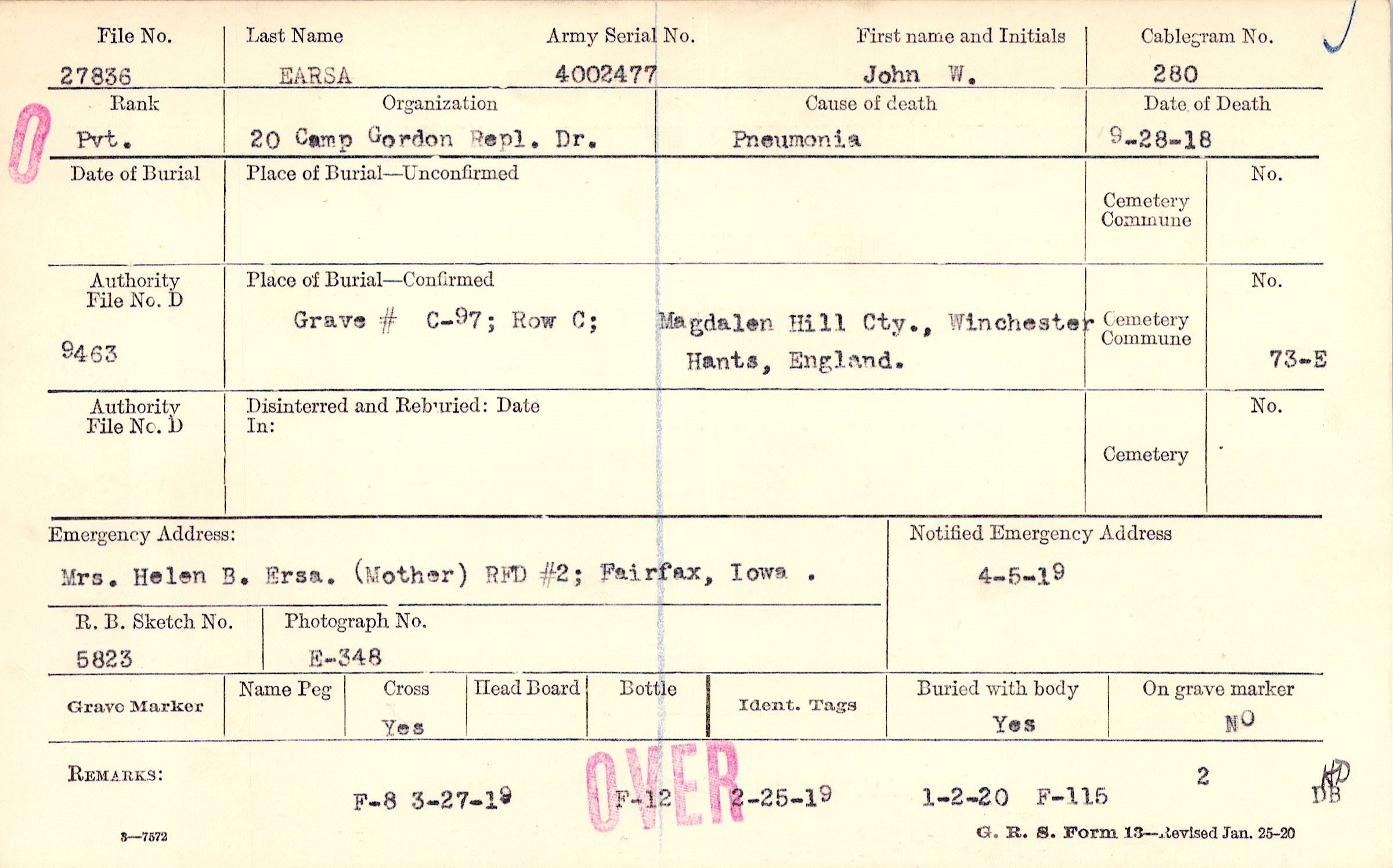 Grave # C-97, Row C, Magdalen Hill Cty., Winchester, Hants, England.