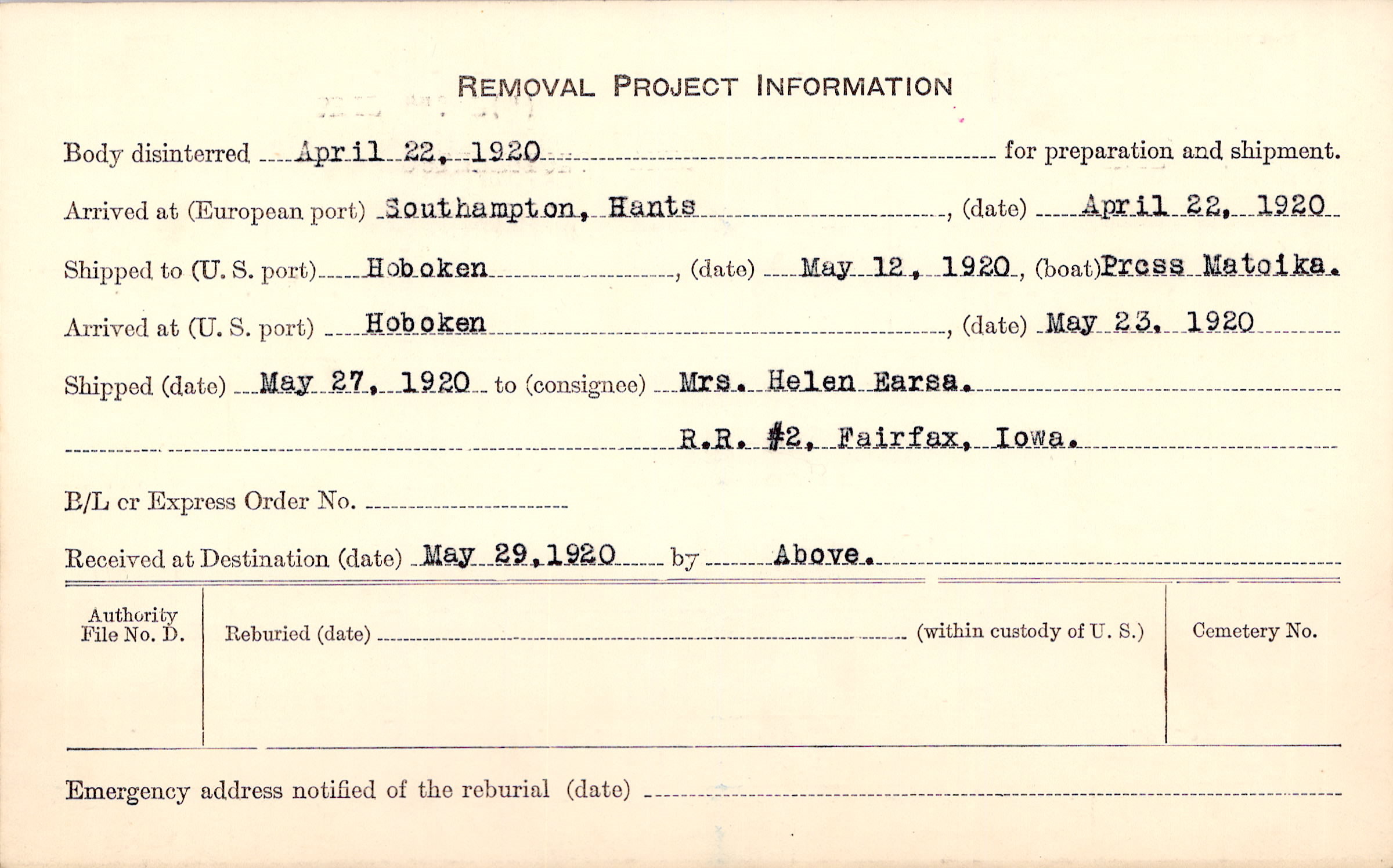 Mrs. Helen B. Ersa. (Mother), RFD #2; Fairfax, Iowa .