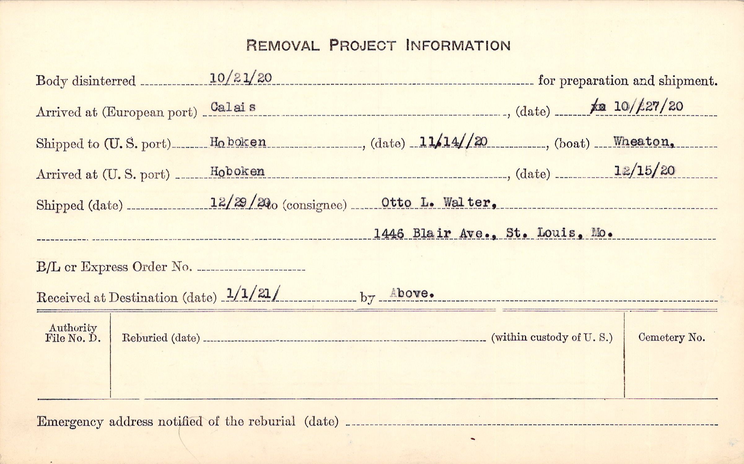 Body disinterred 10/21/1920 for preparation and shipment.