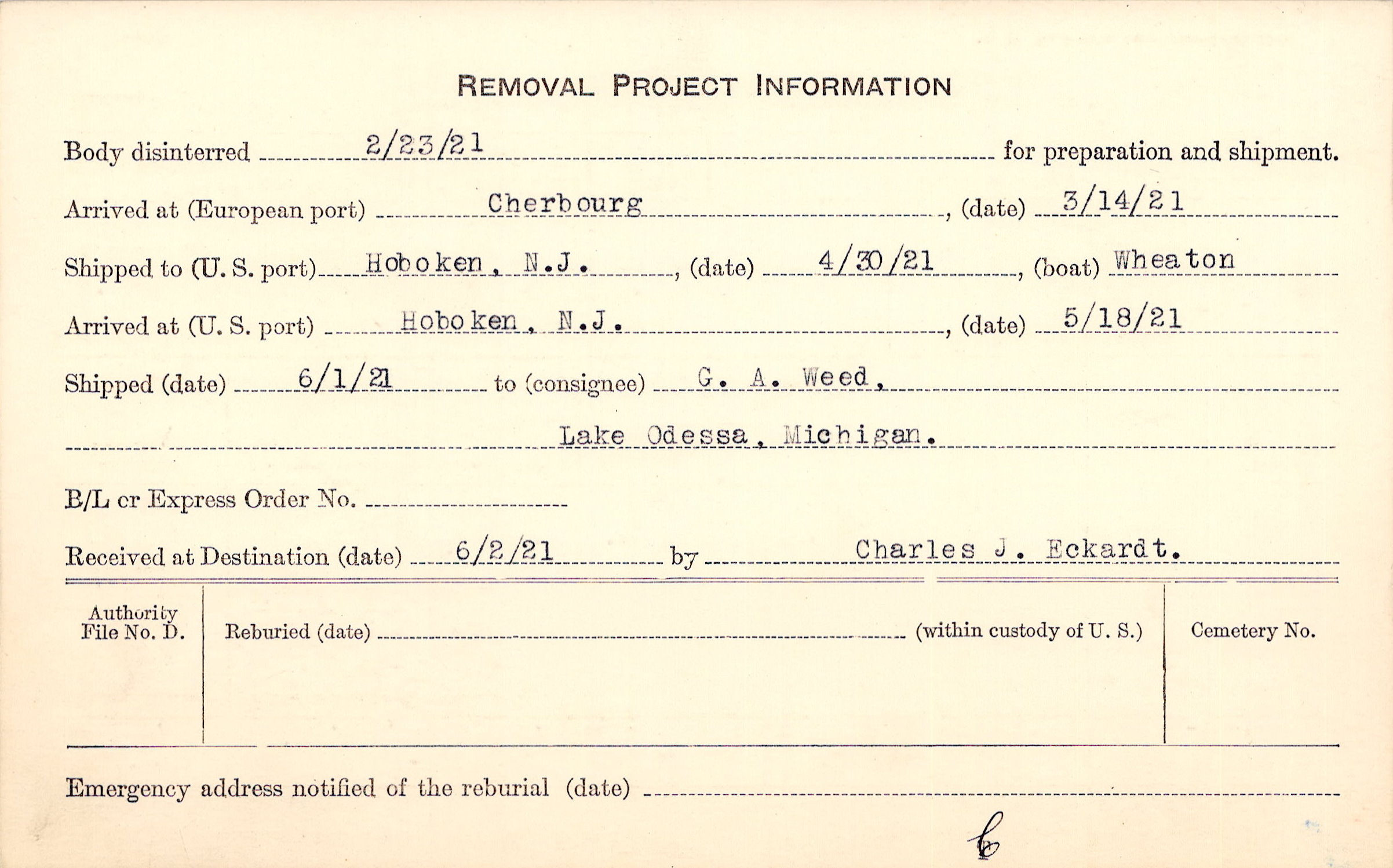 Body disinterred 2/23/1921 for preparation and shipment.