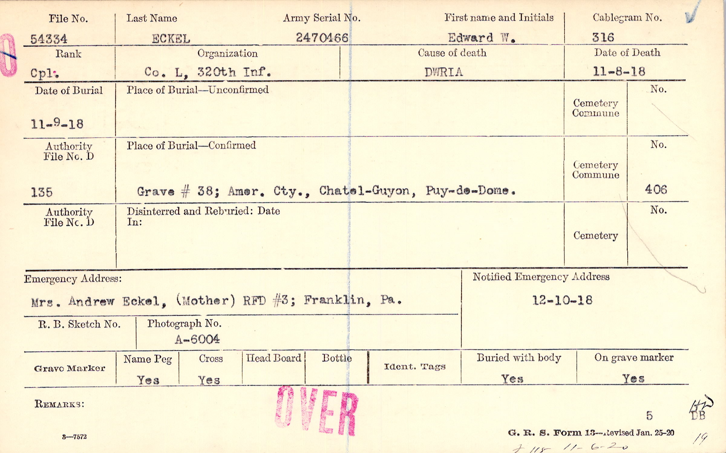 Mrs. Andrew Eckel, (Mother), RFD #3; Franklin, Pa.
