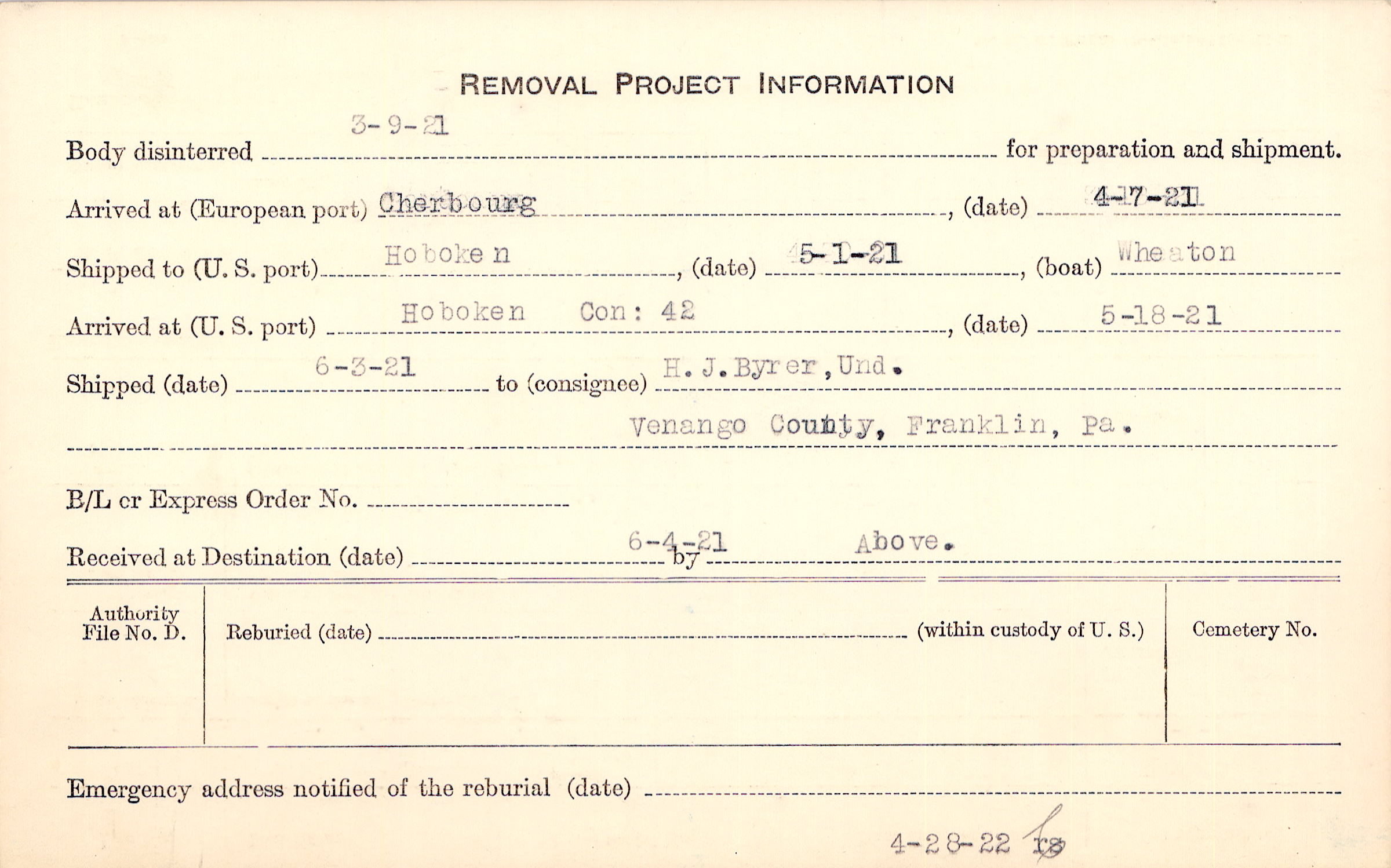 to H.J. Byrer, Und., Venango County, Franklin, Pa.