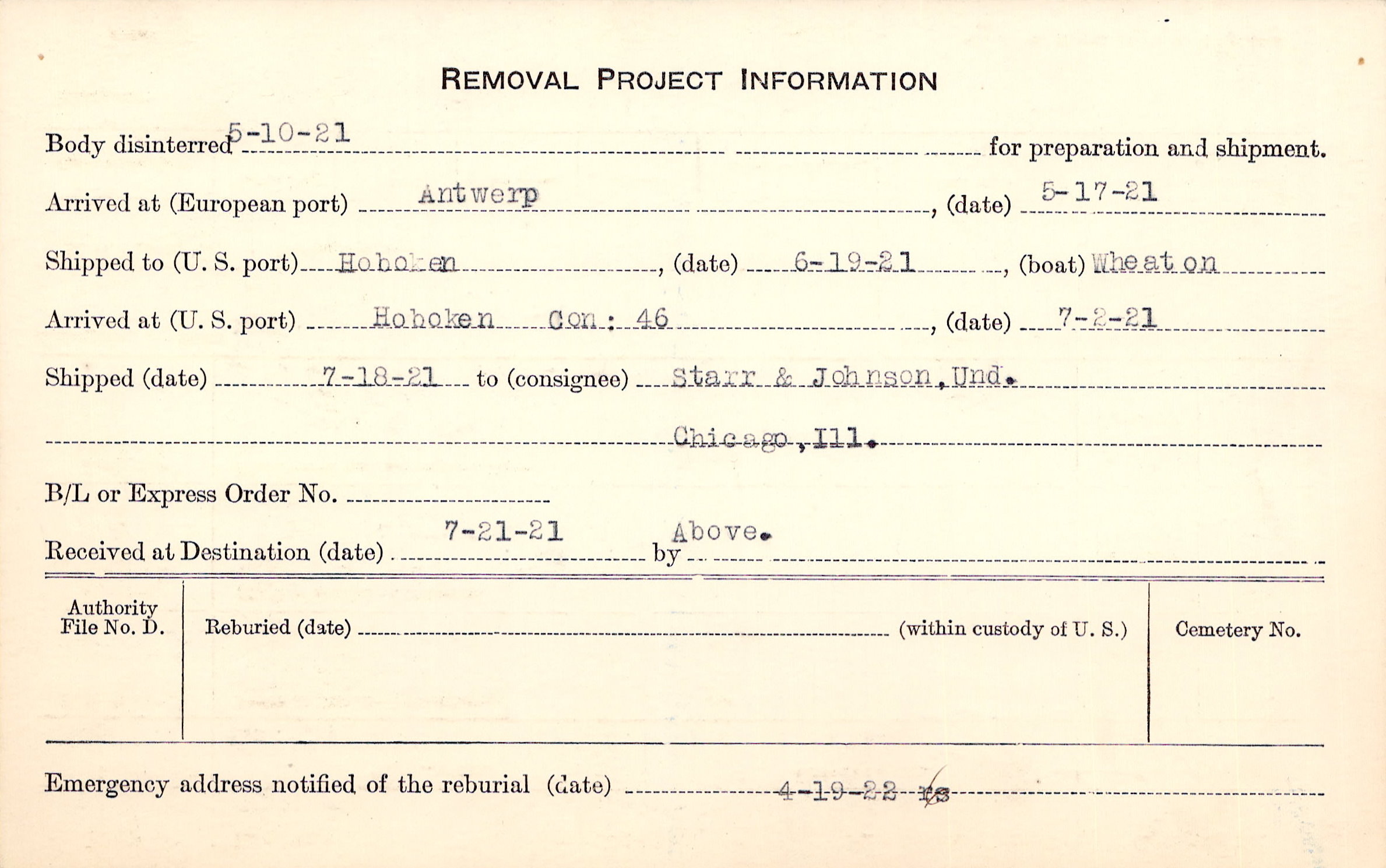 Body disinterred 5/10/1921 for preparation and shipment.