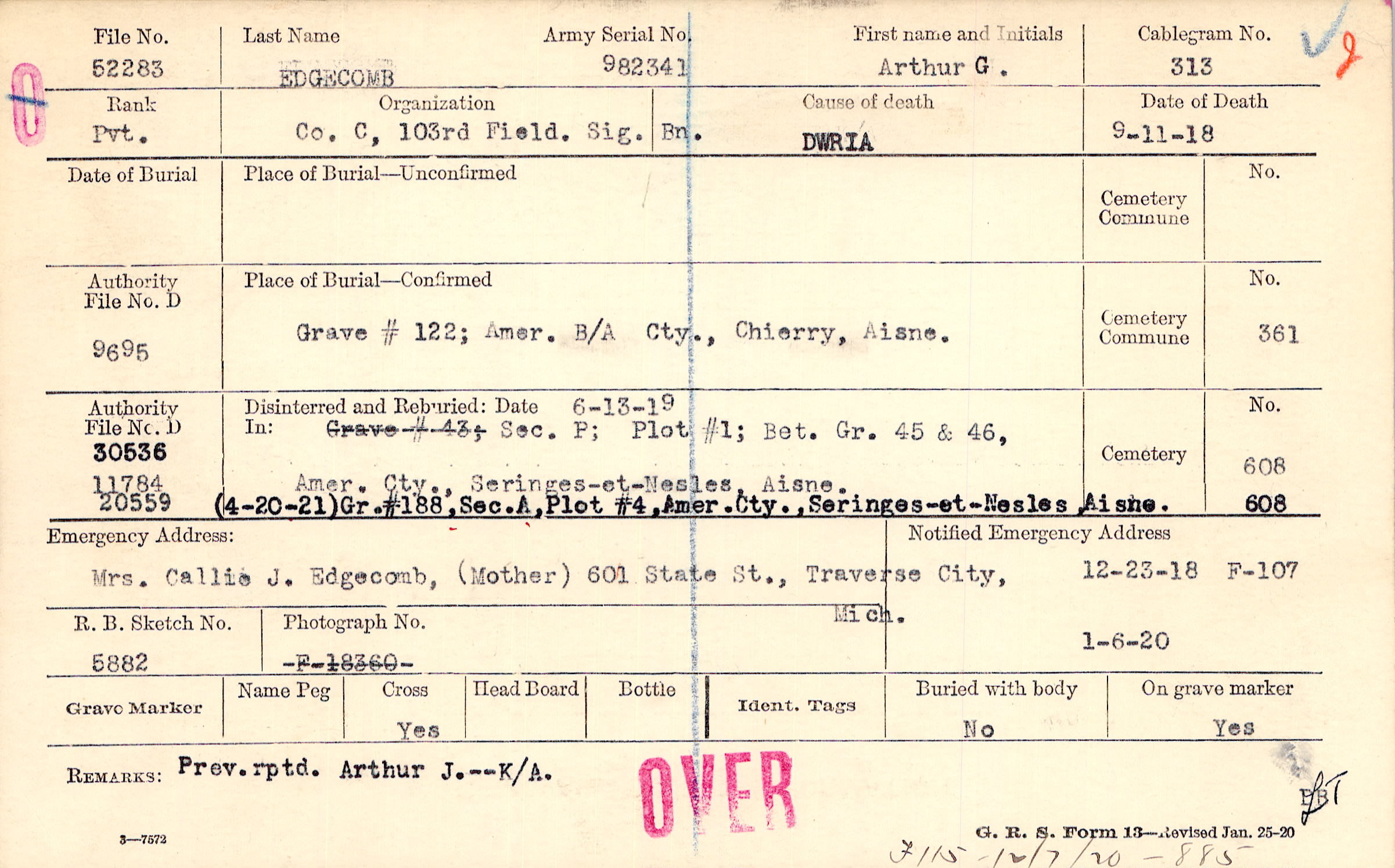Mrs. Callie J. Edgecomb, (Mother), 601 State St., Traverse City, Mich.