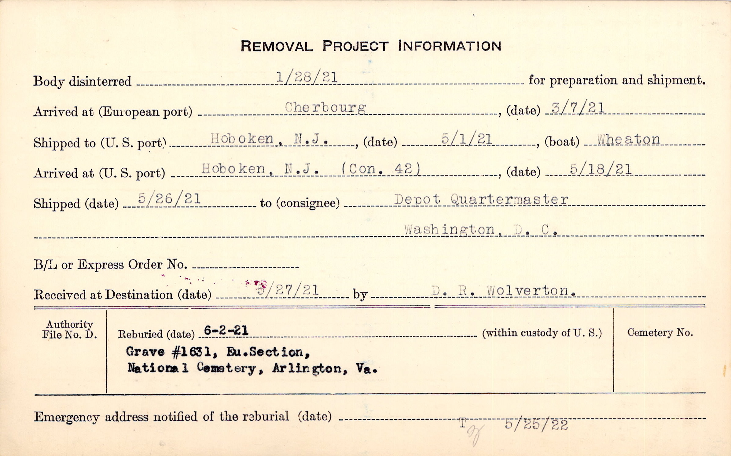 Body disinterred 1/28/1921 for preparation and shipment.