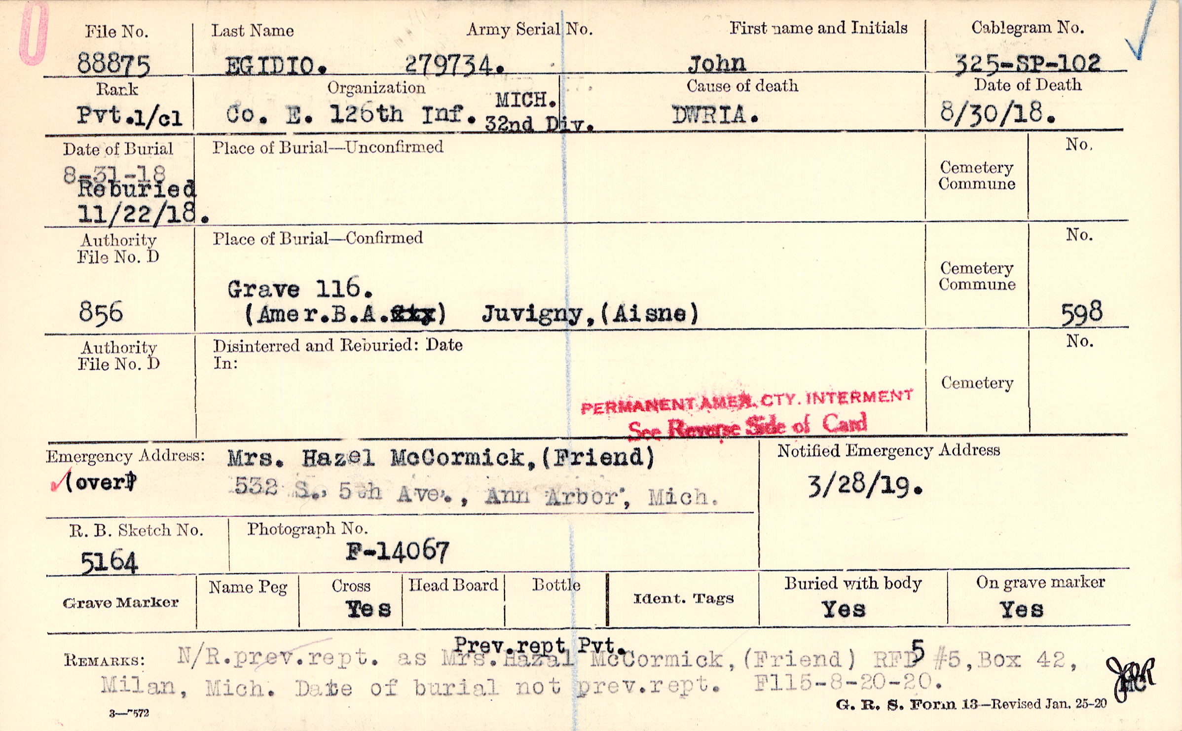 Prev.rept. Pvt. N/R/prev/rept. as Mrs. Hazal McCormick, (friend) RFD #5, Box 42, Milan, Mich. Date of burial not prev.rept., F115-8-20-20