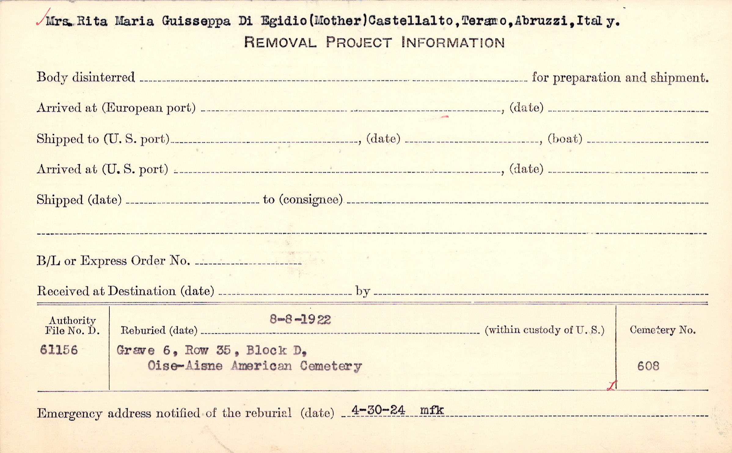 8/31/18, Reburied 11/22/1918