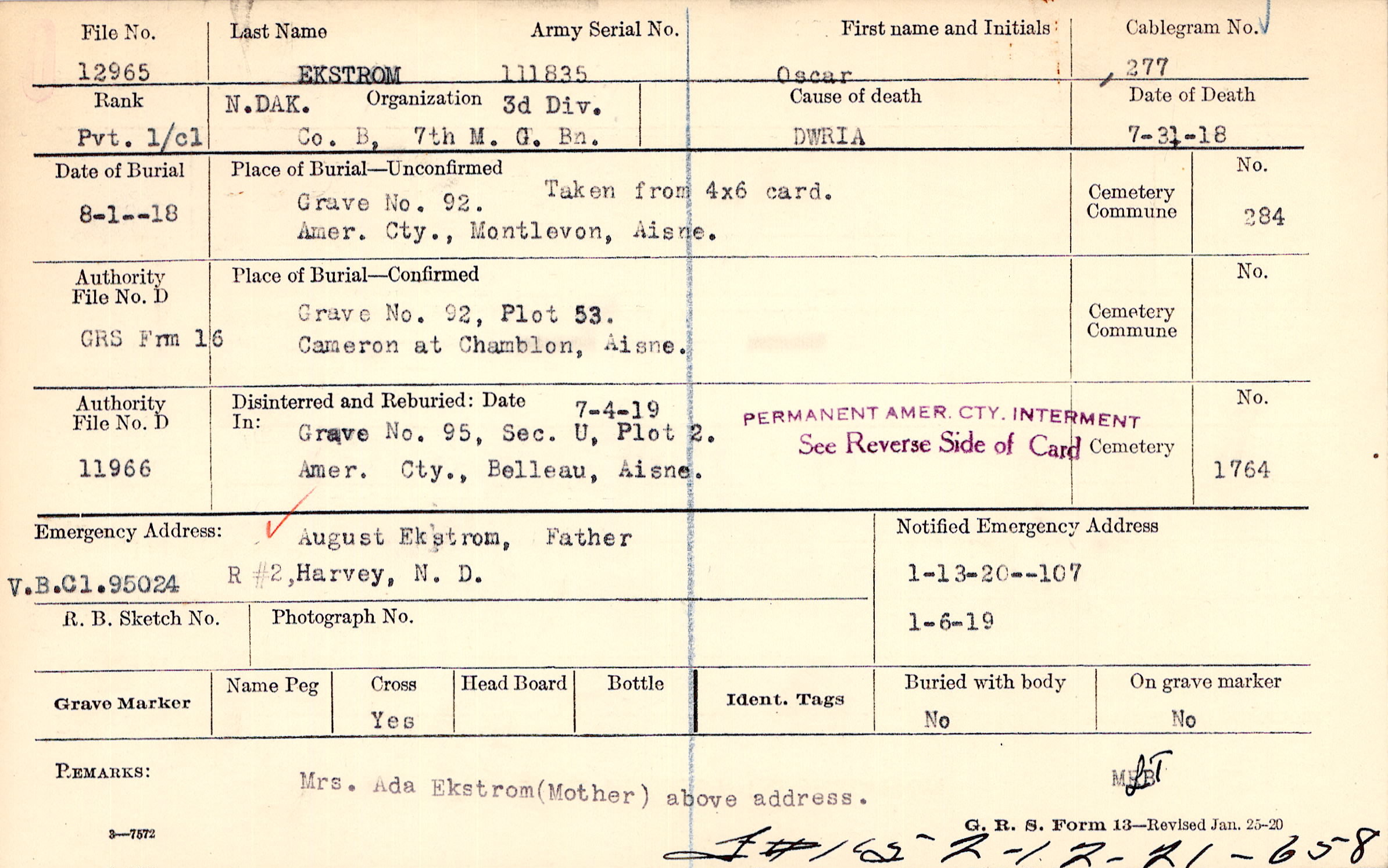August Ekstrom, Father, R #2, Harvey, N. D., V.B.C1.95024