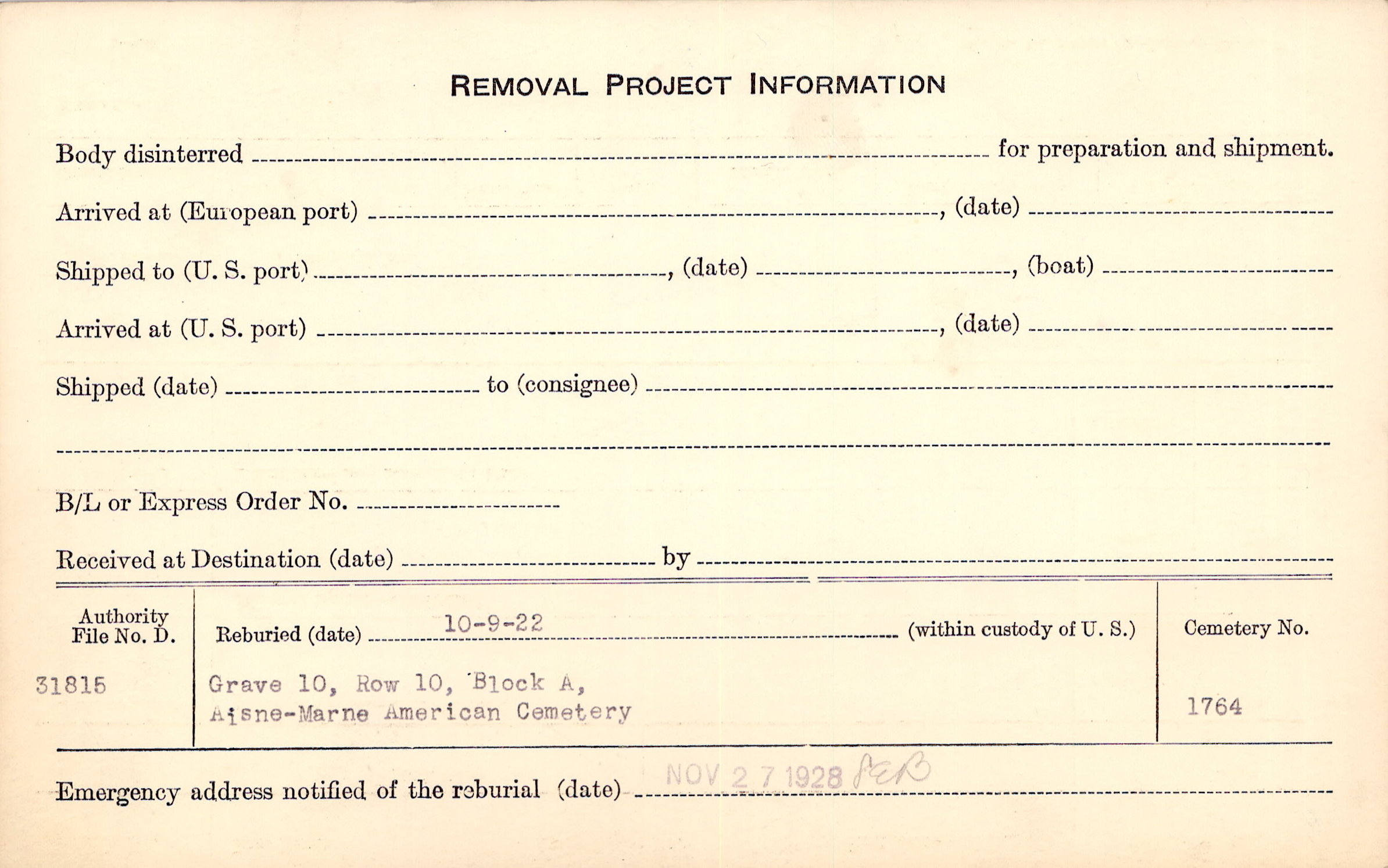 | Permanent Burial in Foreign Cemetery |