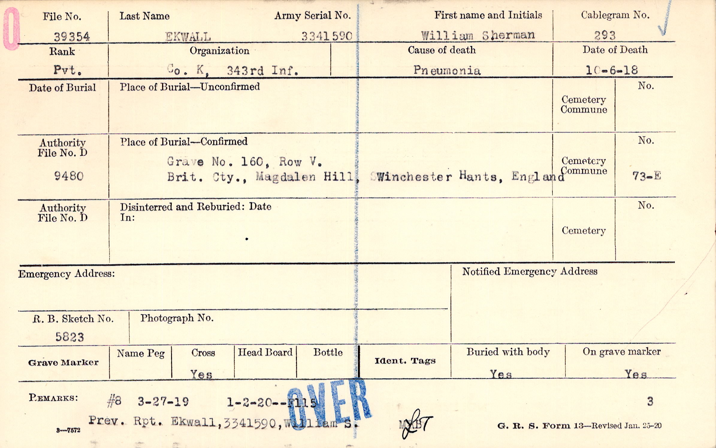 Grave 160, Row V, Brit. Cty., Magdalen Hill, Winchester, Hants, England