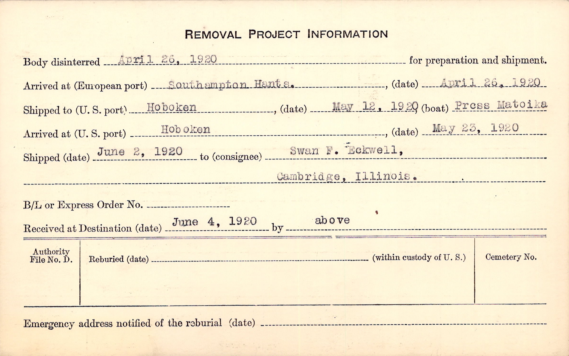 Body disinterred 4/26/1920 for preparation and shipment.