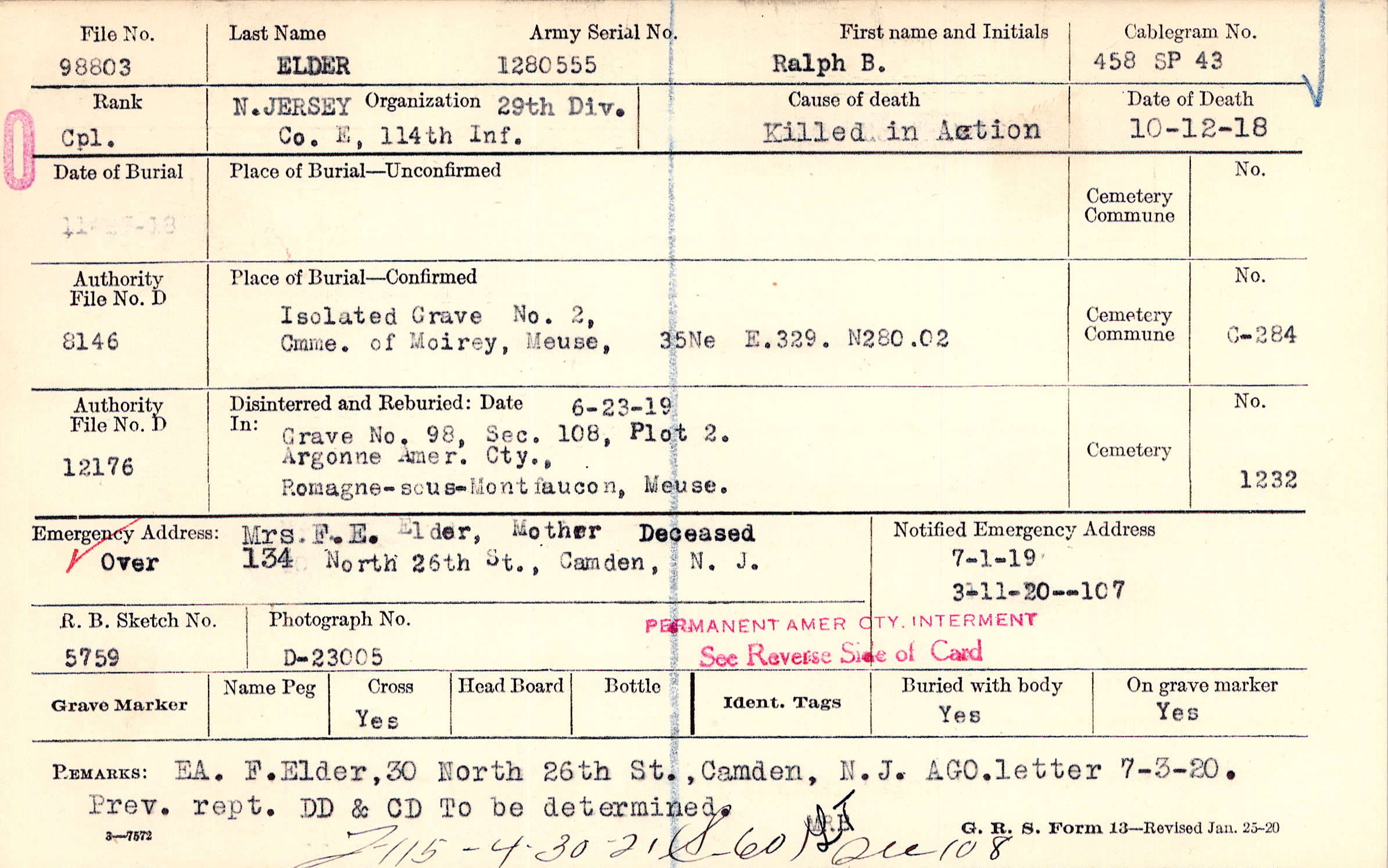 Mrs. F.E. Elder, Mother, 134 North 26th St., Camden, N. J., Deceased Over