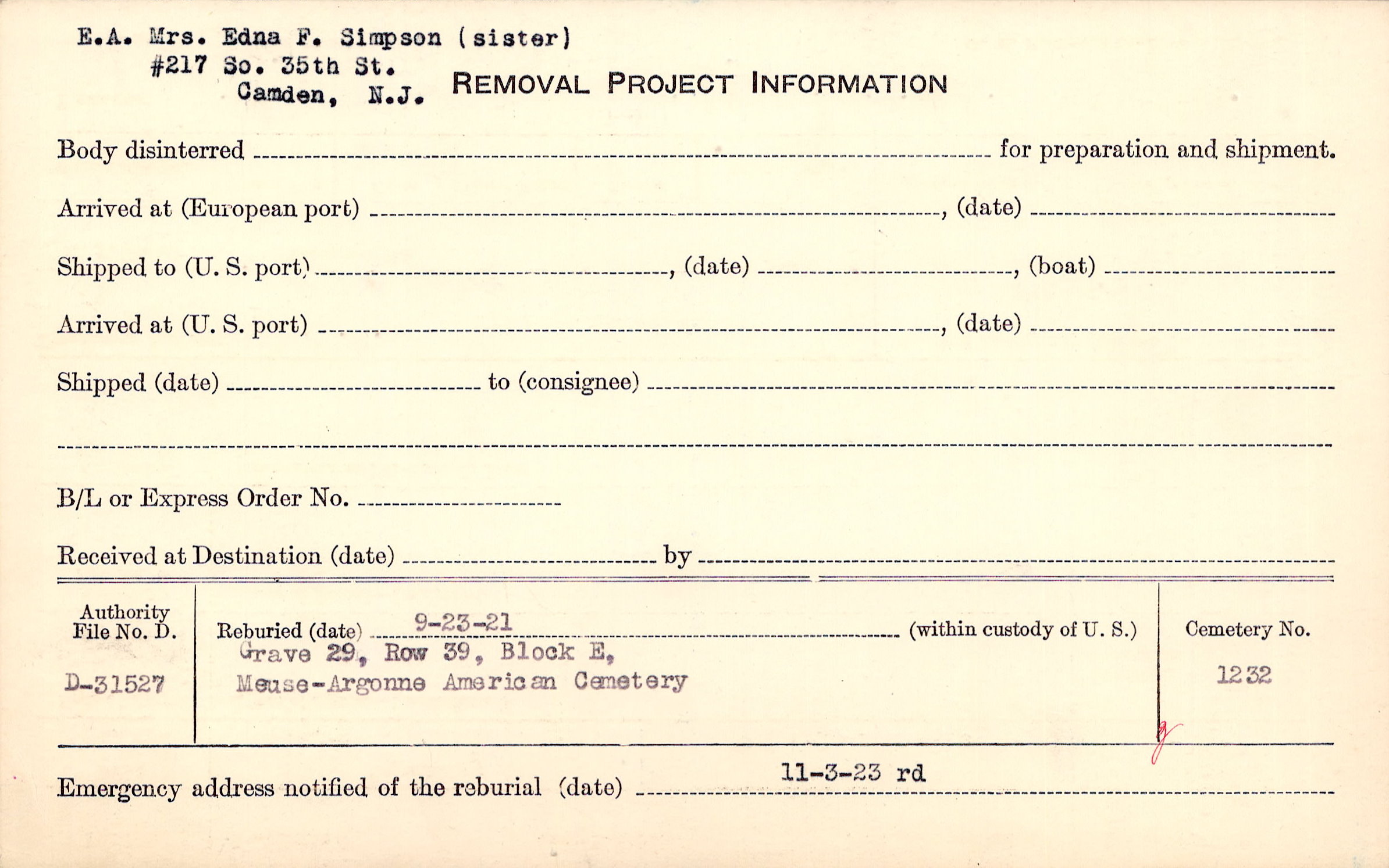 E.A. Mrs. Edna F. Simpson (sister), #217 So. 35th St., Camden, N.J. |