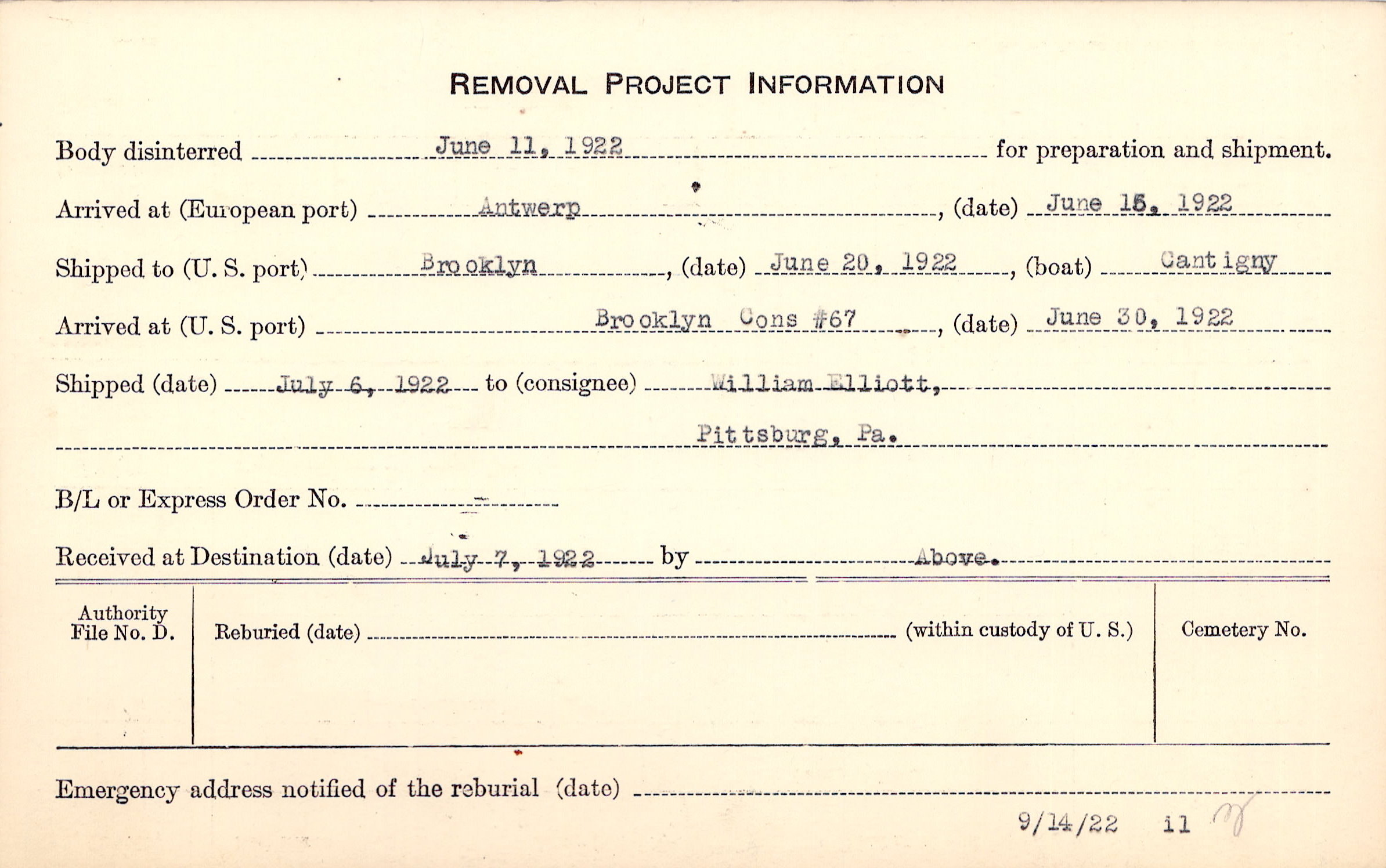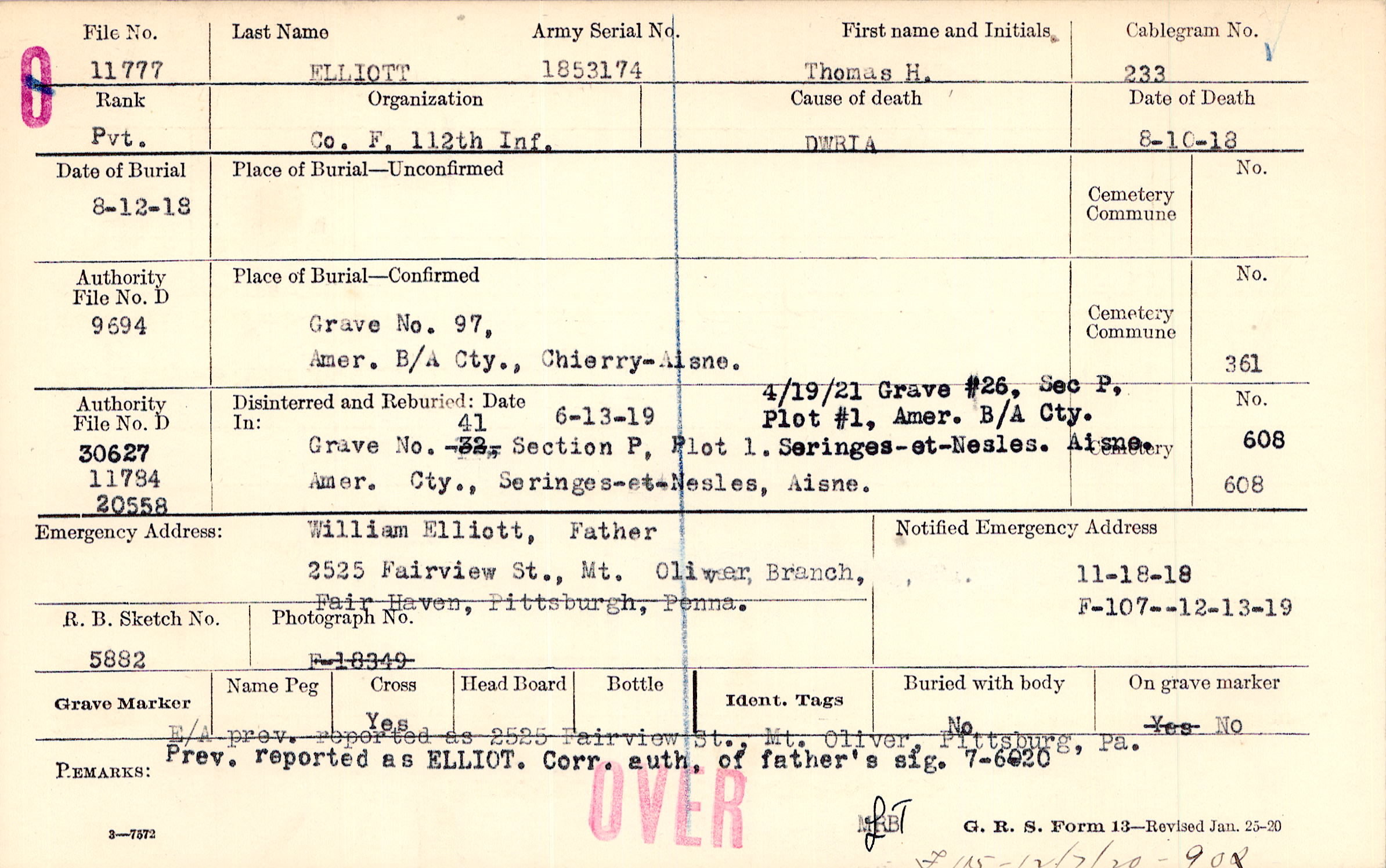 William Elliott, Father, 2525 Fairview St., Mt. Oliver, Branch, Fair Haven, Pittsburgh, Penna.