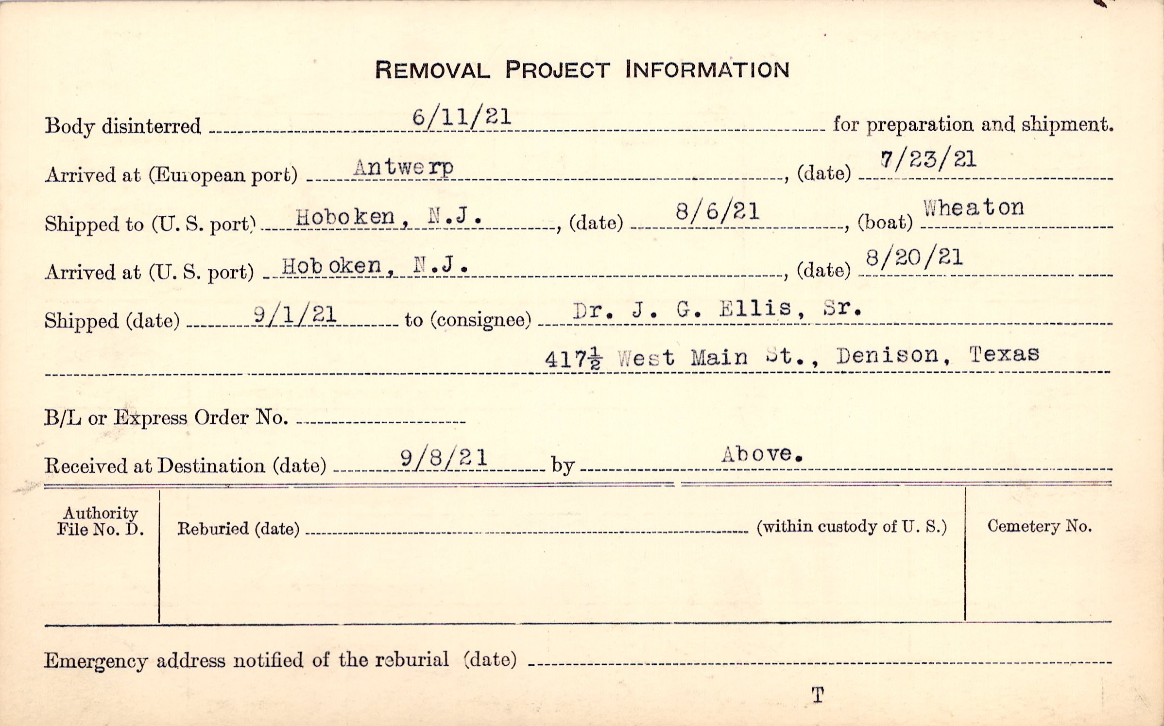 Body disinterred 6/11/1921 for preparation and shipment.