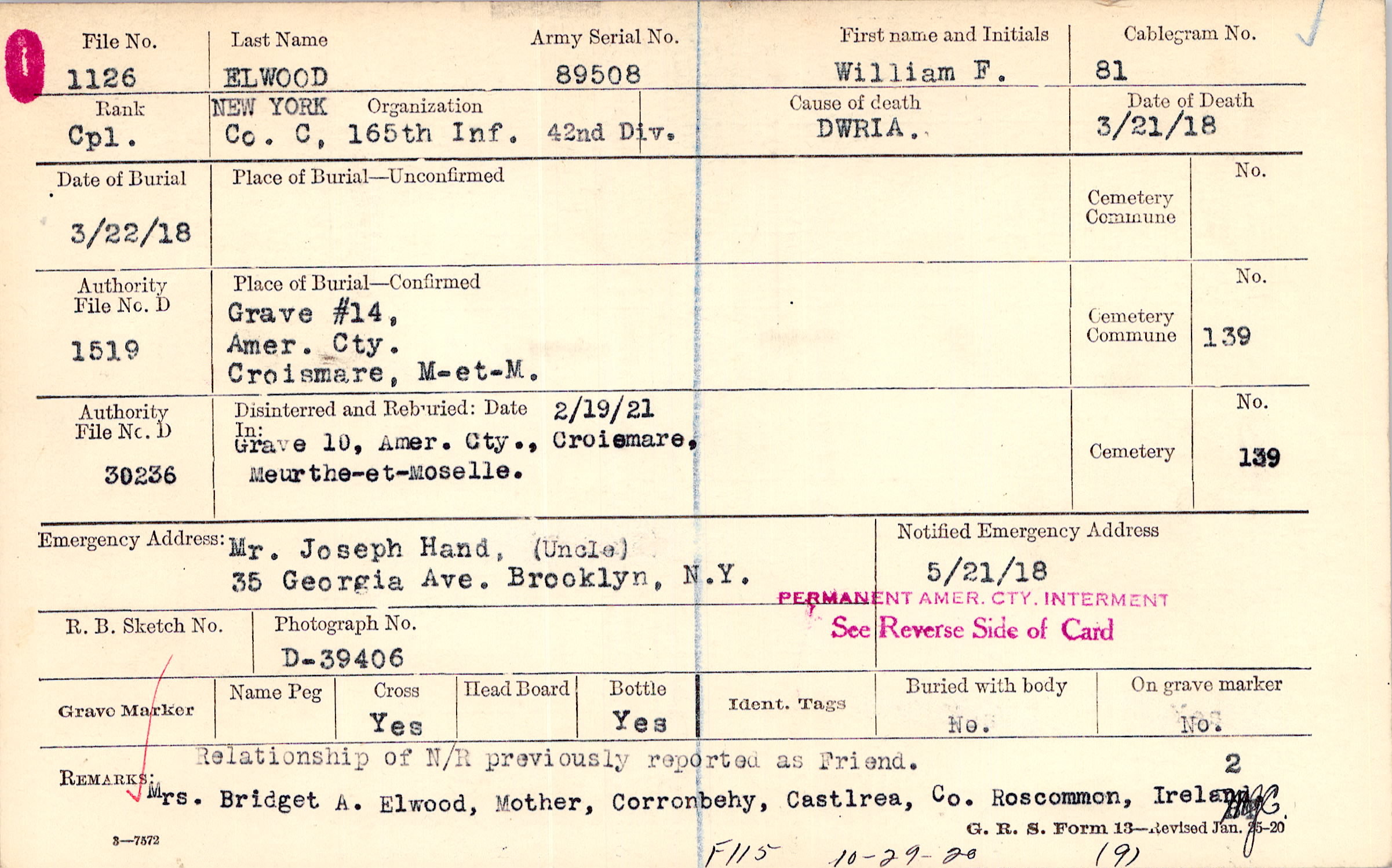 Relationship of N/R previously reported as Friend. Mrs. Bridget A. Elwood, Mother, Corronbehy, Castlrea, Co. Roscommon, Ireland., F115 10-29-20 (9)